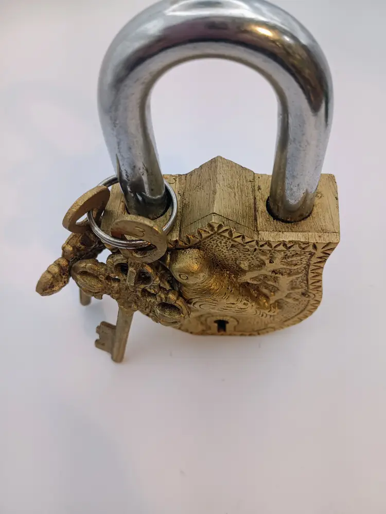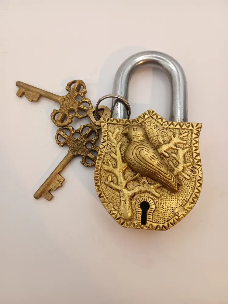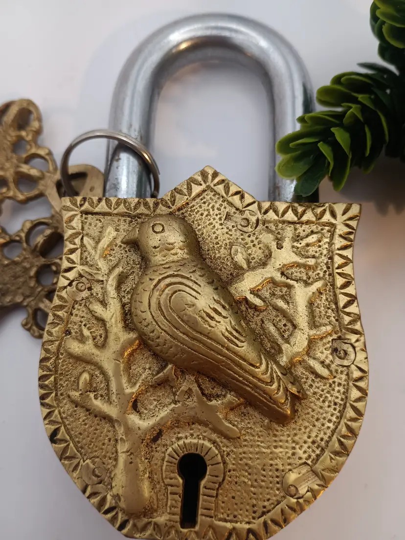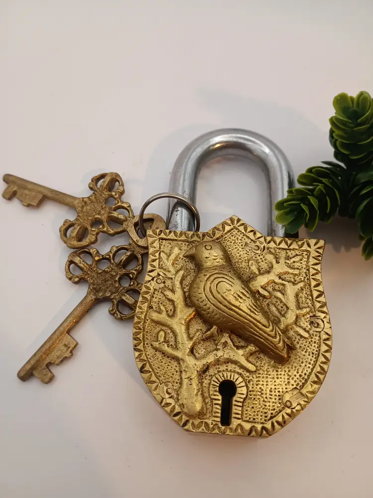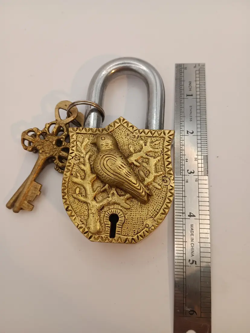 Hi thanks for looking! This is a beautiful piece! I had a hard time giving it up :) In this listing you will receive a brass and steel bird padlock. This piece is approximately 4.5 inches tall and 2 inches wide. The brass keys are 3 inches long. The keys work and hang from a key ring.