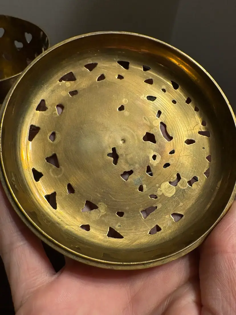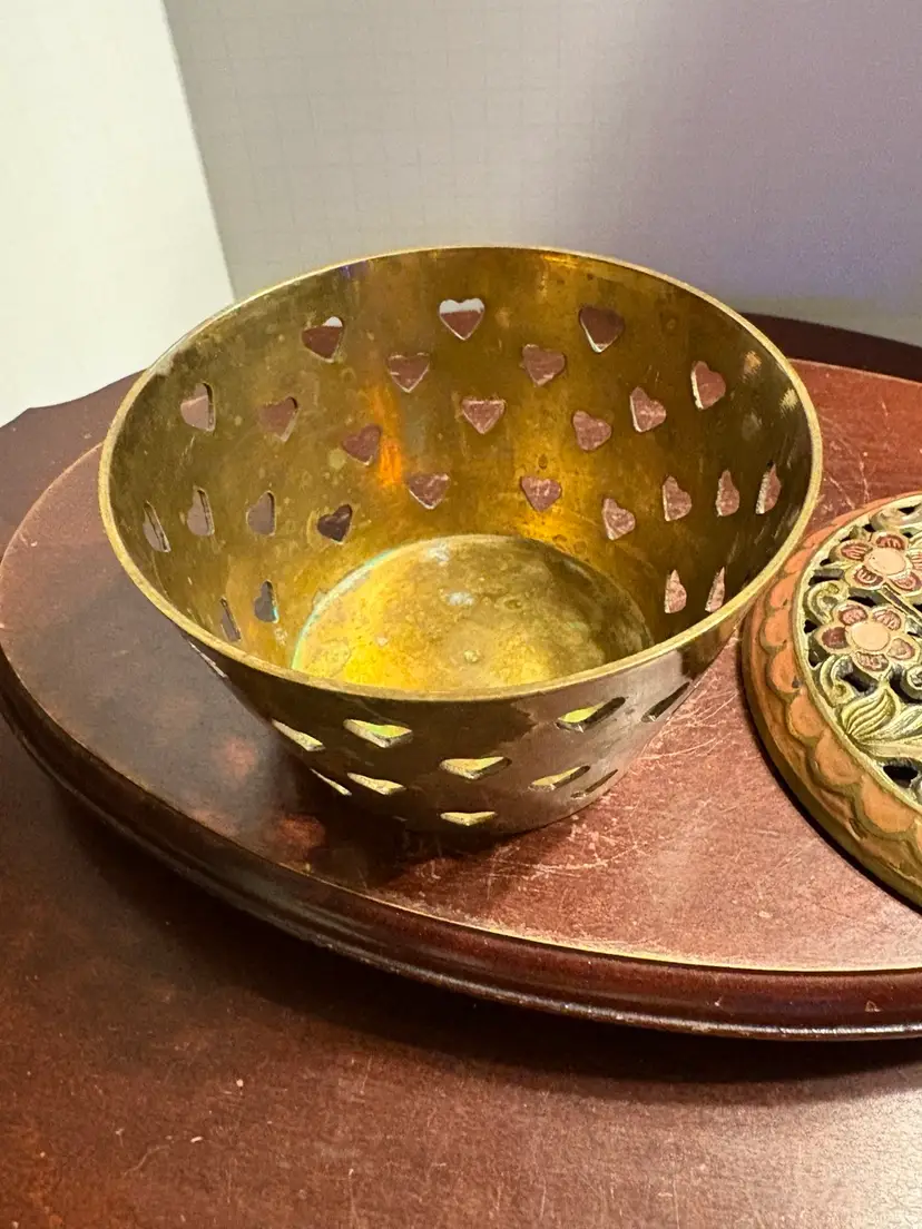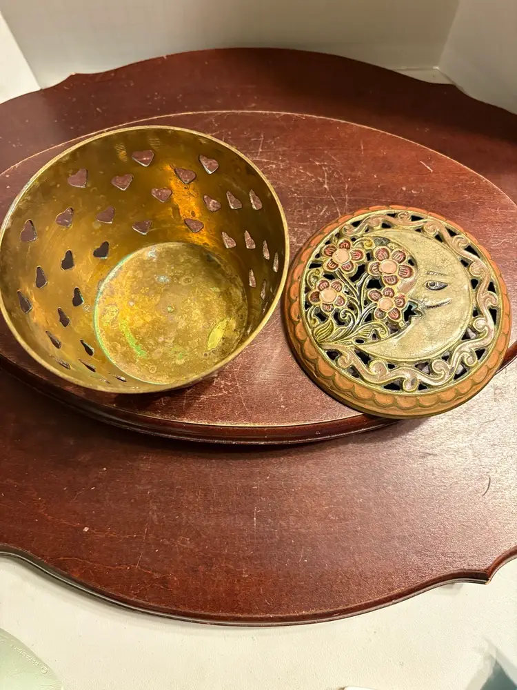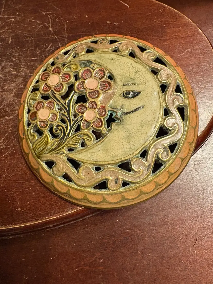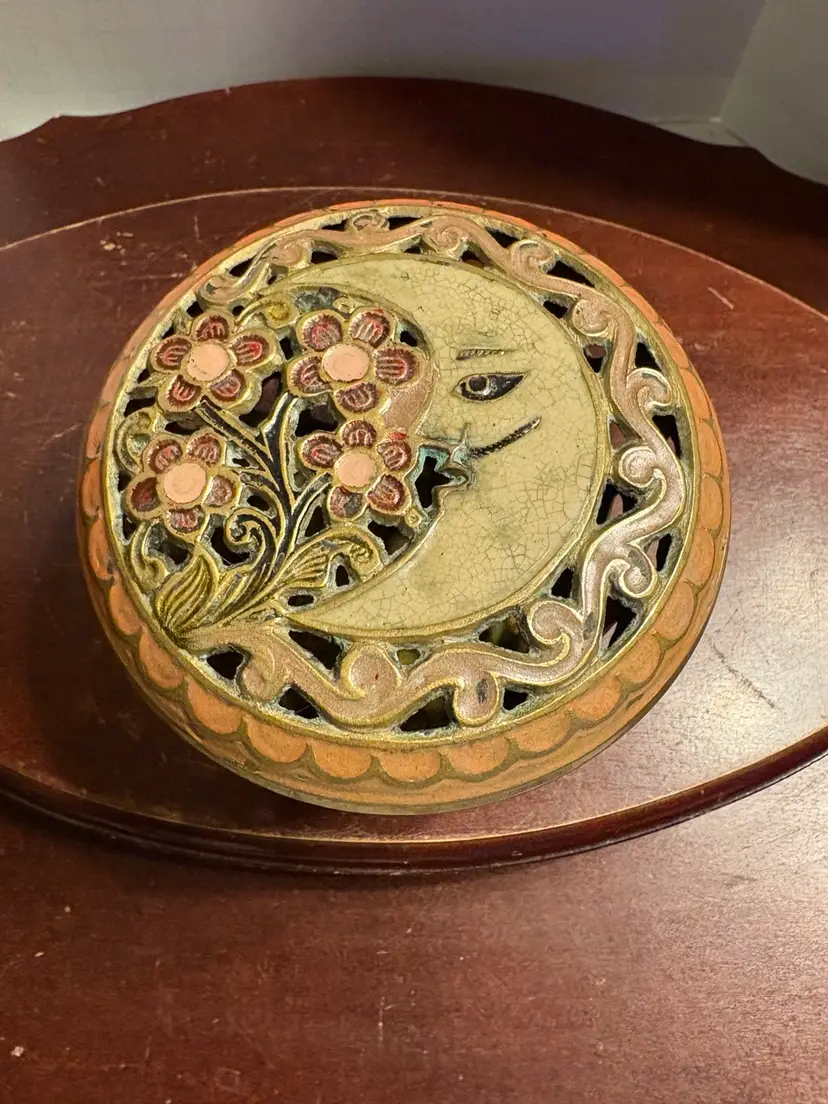 Brass Potpourri Box With Moon And Floral Enameled Lid