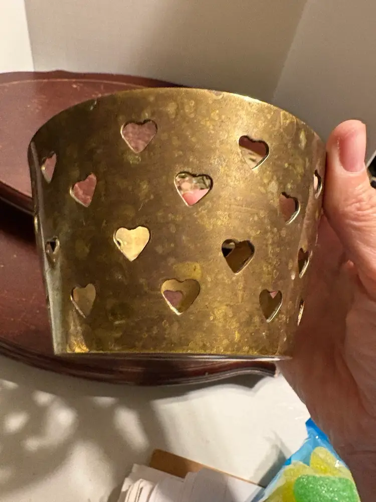 3” tall and 5” wide, heart cut outs on base, made in India