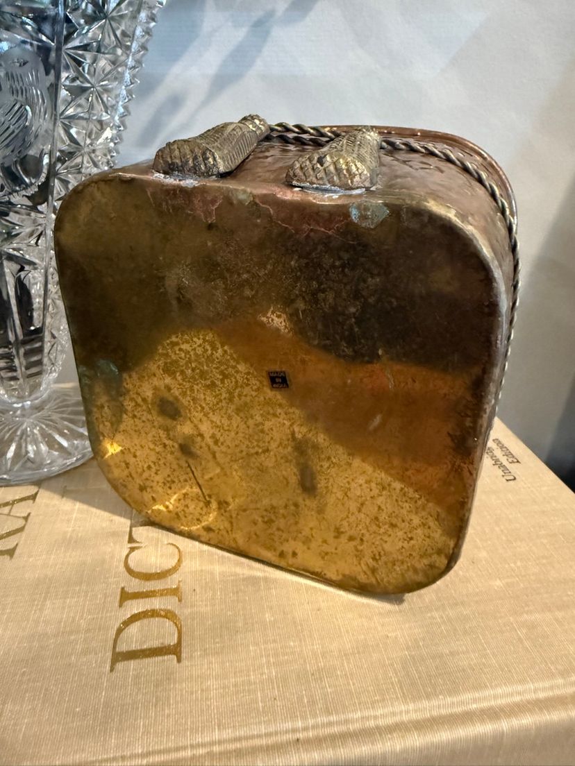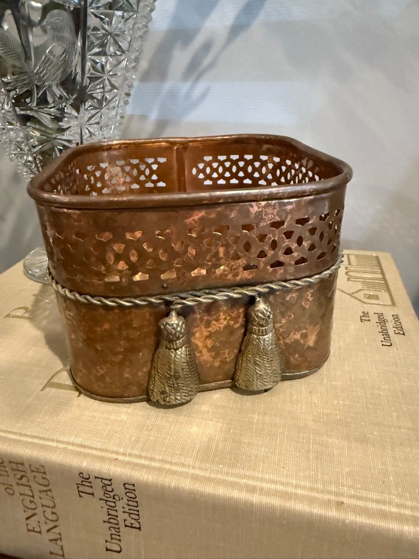 Vintage Brass Square Planter Basket — Made in India. This charming vintage brass basket features an ornate cut-out design around the top, perfect for adding a touch of classic elegance to your home decor. It functions beautifully as a unique planter, a decorative holder for small items, or as an accent piece on a shelf or table. The brass has a lovely aged patina, showcasing its vintage character.