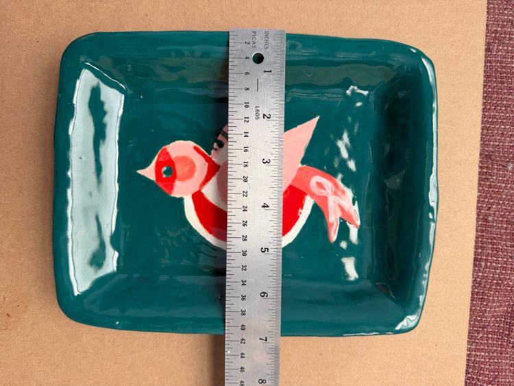 Breast Cancer Awareness - Pottery Studio Made By Me - Trinket Dish / Wall Plate - Pink, White And Red Bird On Green Background - Has Ribbon On Tail
