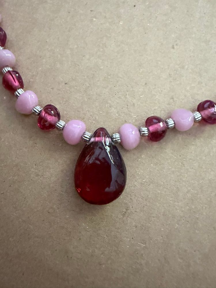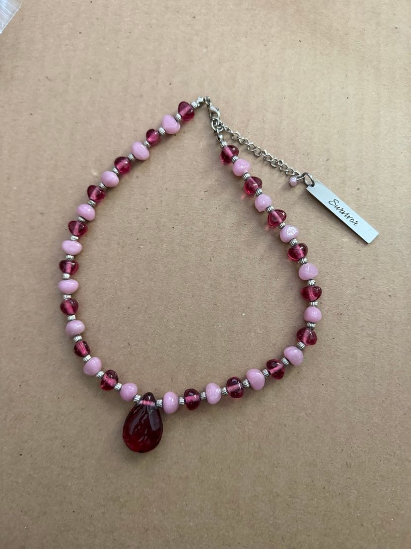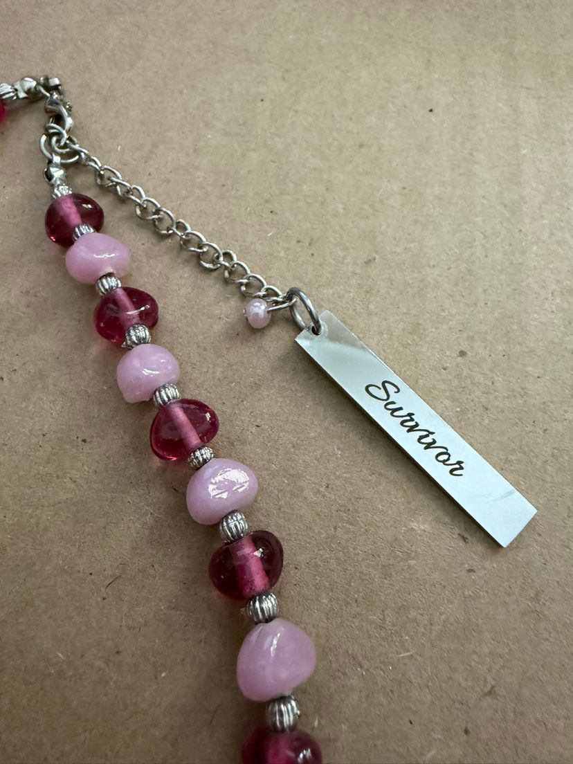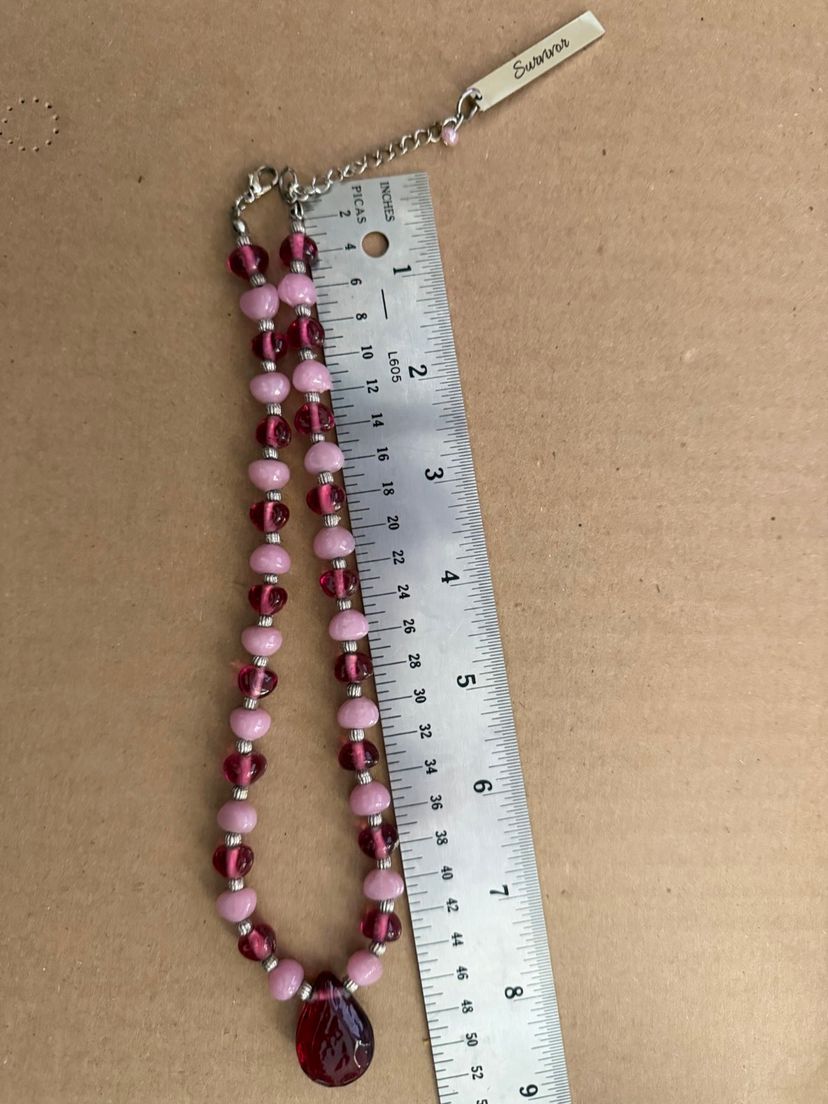 Breast Cancer Awareness / Survivor Necklace - glass Beads In Pinks And Silver Tone With Teardrop Pendant And Silver Tone Survivor Charm.