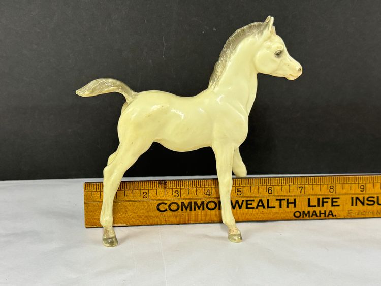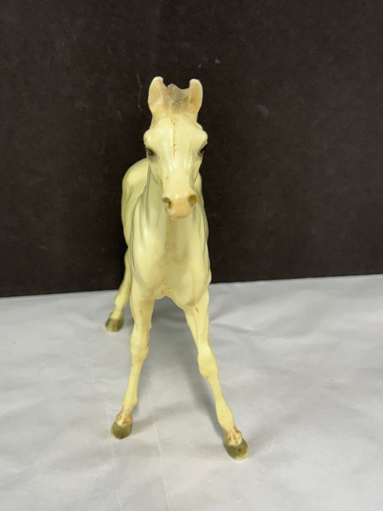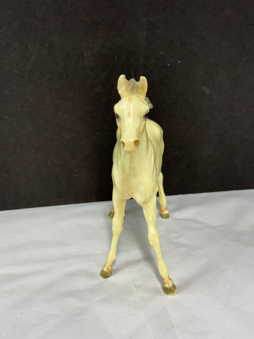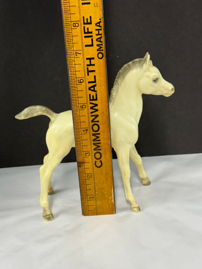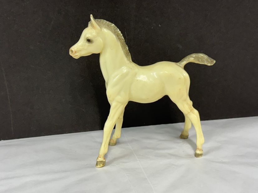 Breyer Arabian Foal Model #9 glossy alabaster, grey mane/tail, pink, grey pink or white inner ears, some with pink nose 1961-1966 Model has been loved somewhere in its past, it has been on display since I have had it. Once leg has been repaired, there are some scuffs, some fading.