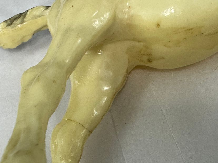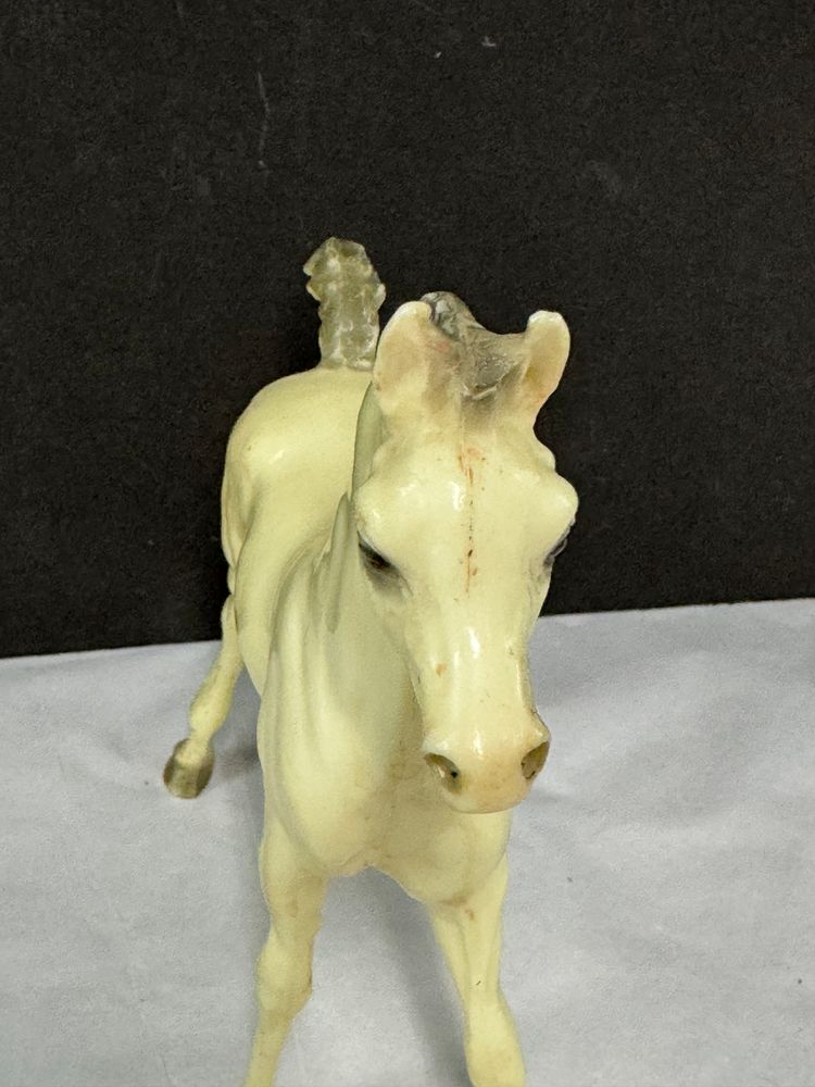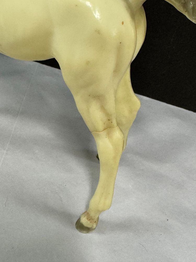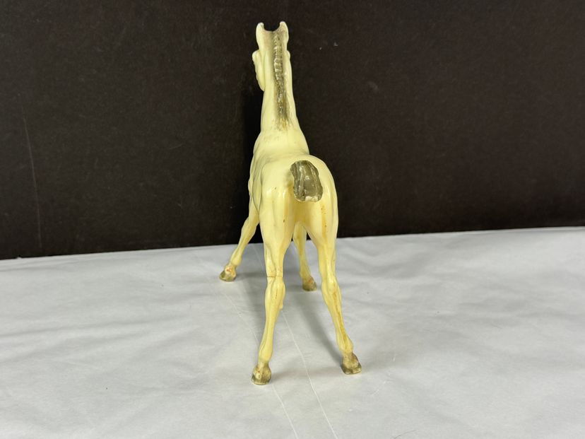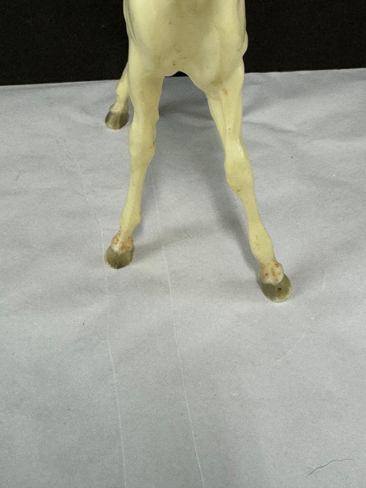Breyer Arabian Foal Model #9 glossy alabaster, grey mane/tail, pink, grey pink or white inner ears, some with pink nose 1961-1966 Model has been loved somewhere in its past, it has been on display since I have had it. Once leg has been repaired, there are some scuffs, some fading.