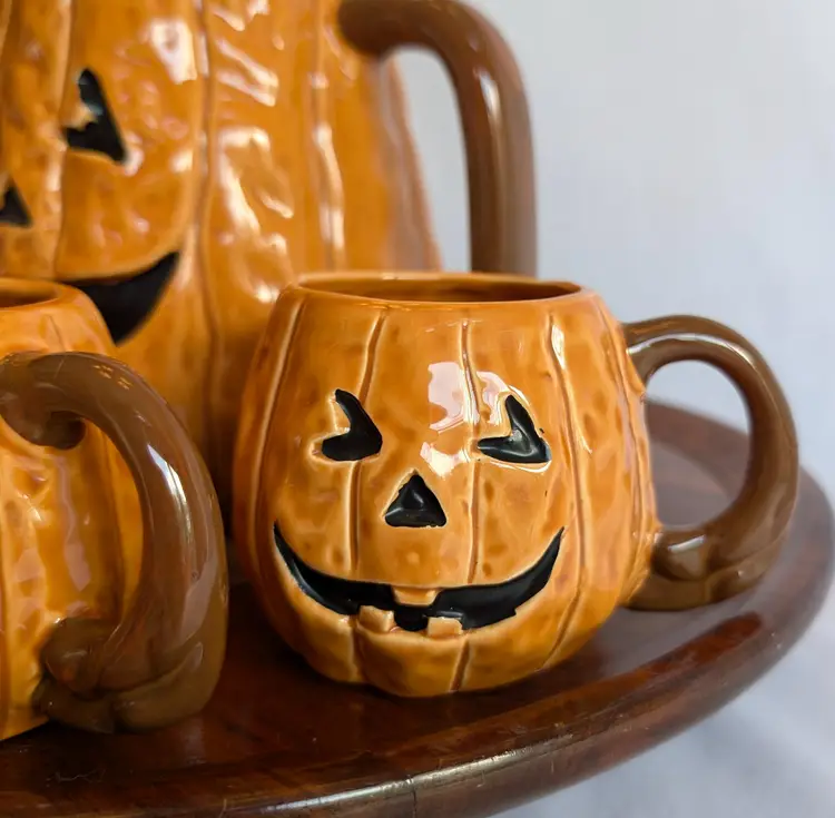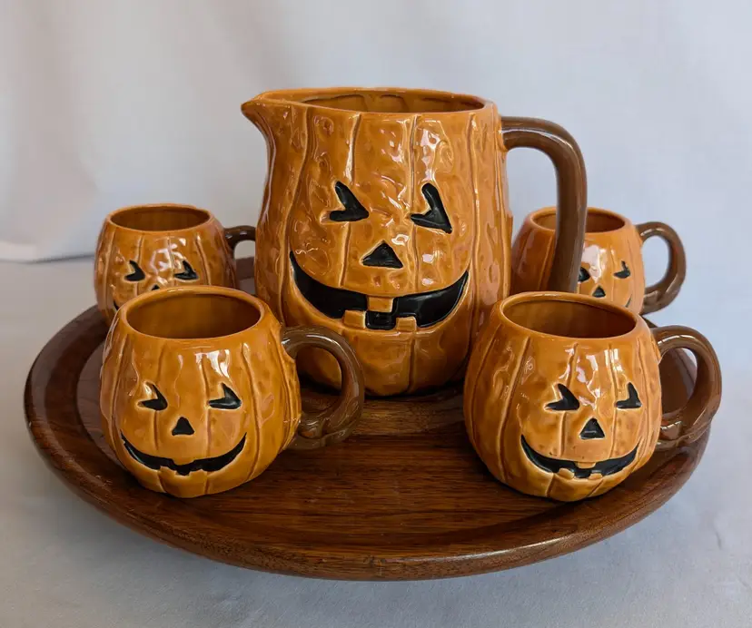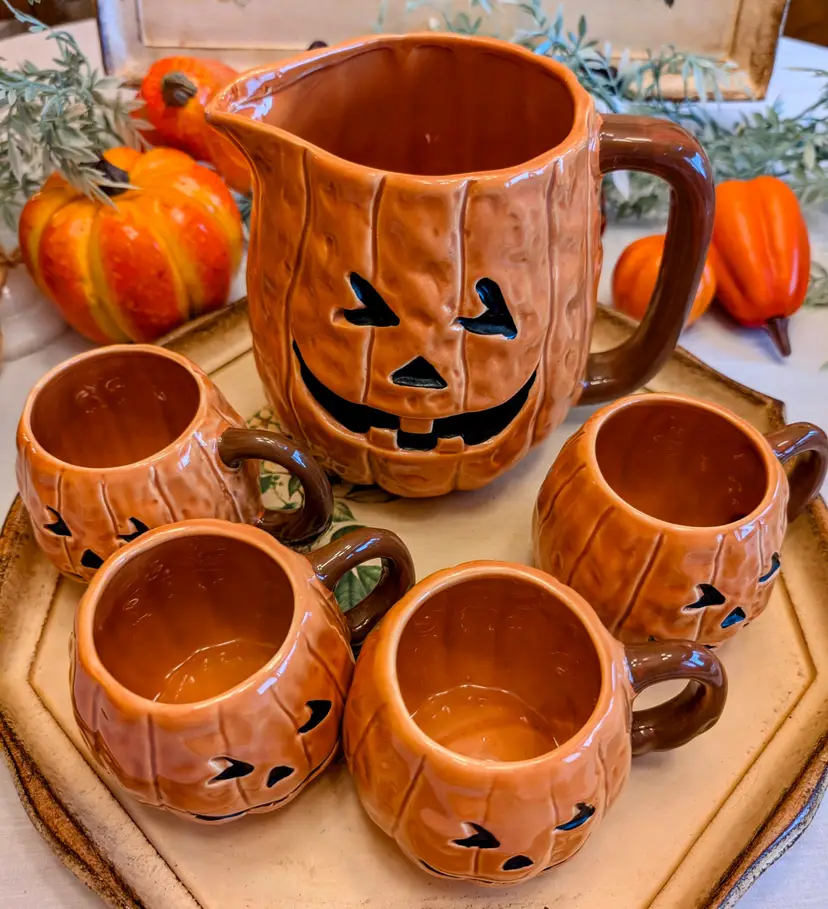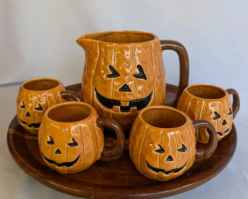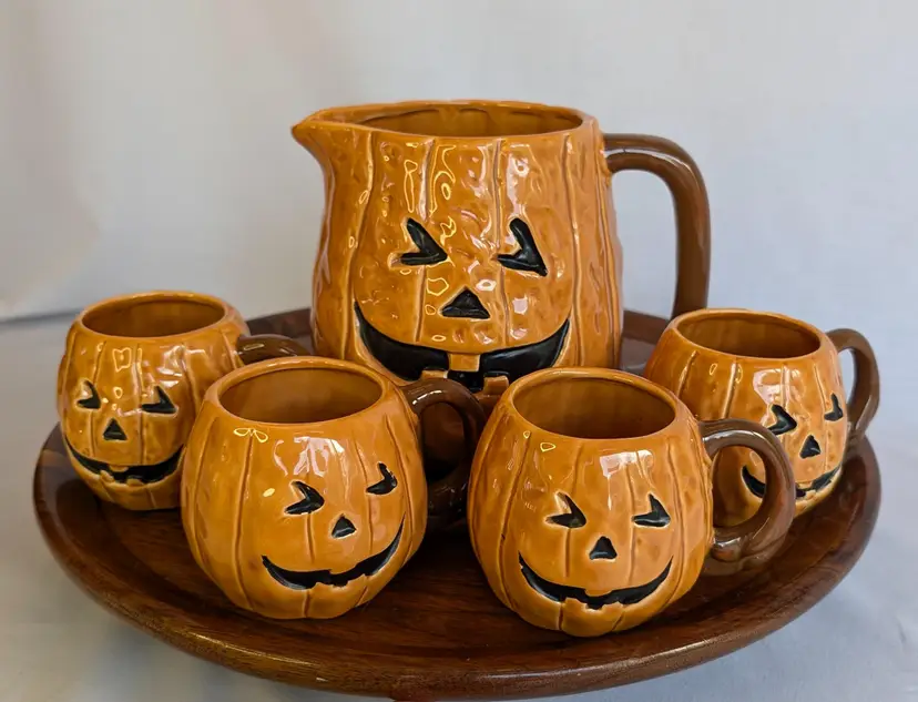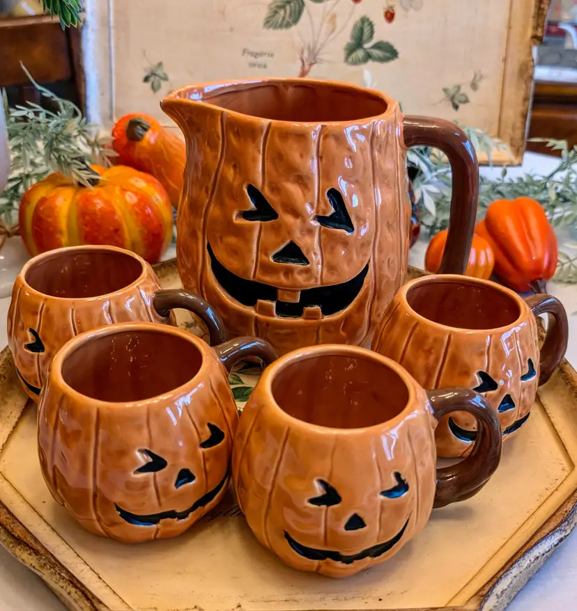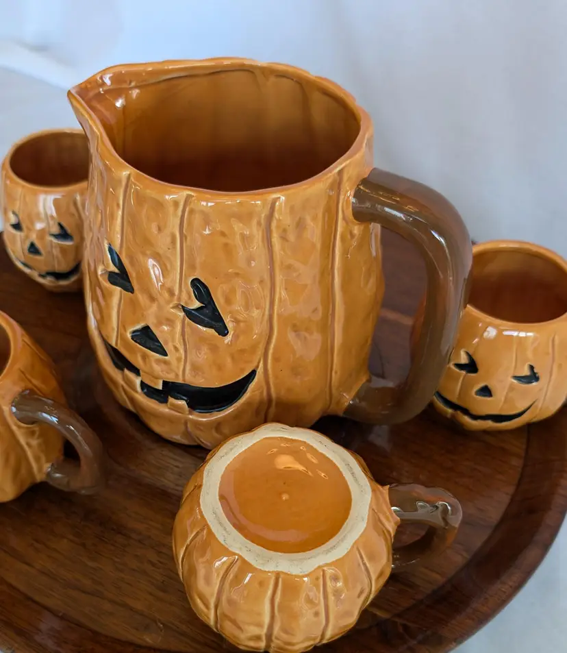 Excellent Used Condition. No chips or cracks. Slight wear to black hand painting due to age and use. So much fun for Halloween. Pitcher holds 5 cups and each mug holds 1 cup. Pitcher is 5.75" high x 5.75" wide diameter x 7" long including handle. Mugs are approx 3" high x 3.25" wide diameter x 4.5" long including handle.
