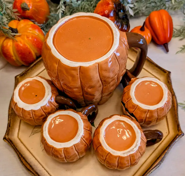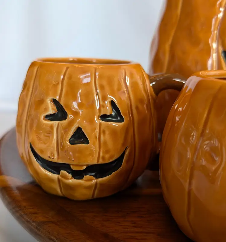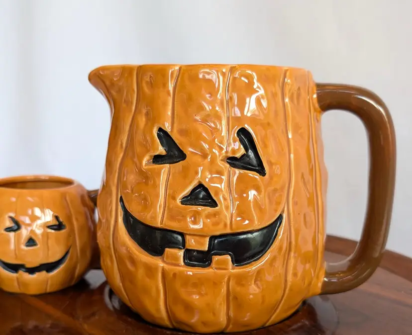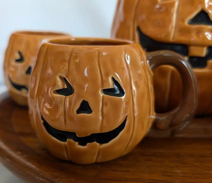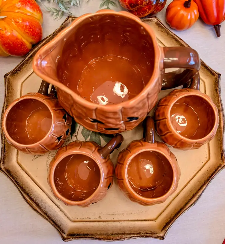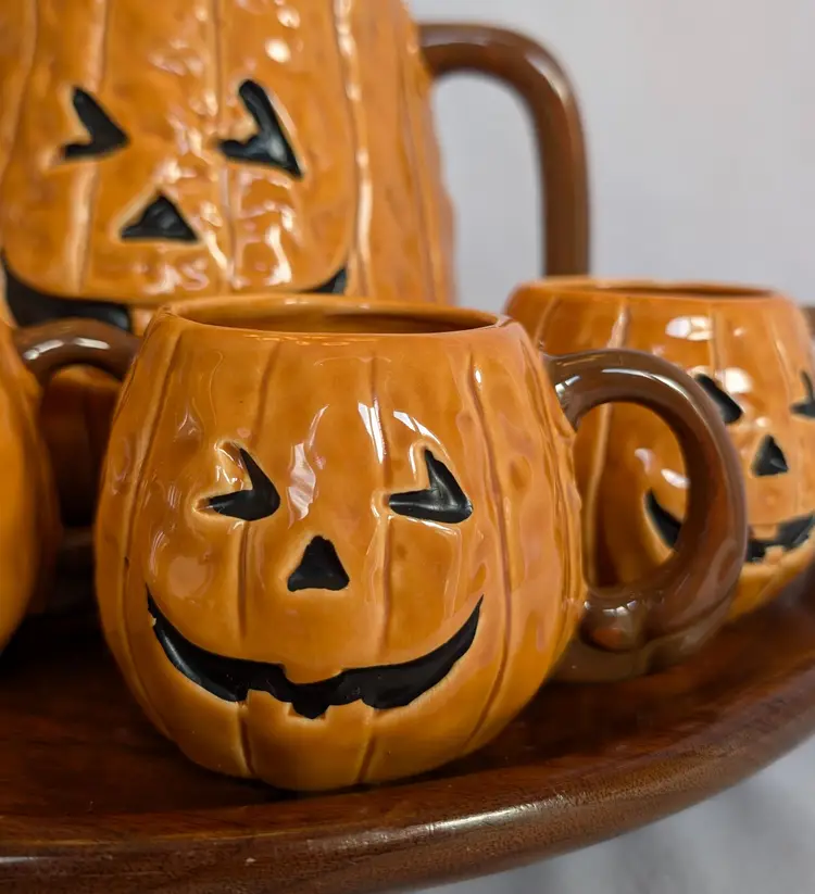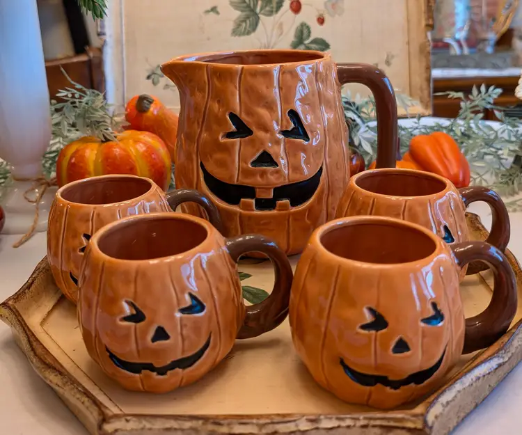 Excellent Used Condition. No chips or cracks. Slight wear to black hand painting due to age and use. So much fun for Halloween. Pitcher holds 5 cups and each mug holds 1 cup. Pitcher is 5.75" high x 5.75" wide diameter x 7" long including handle. Mugs are approx 3" high x 3.25" wide diameter x 4.5" long including handle.