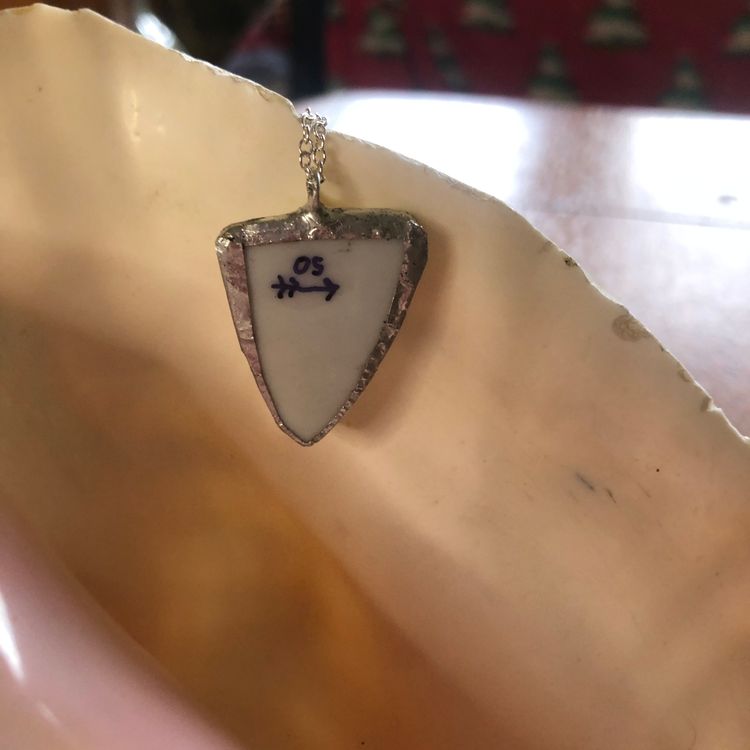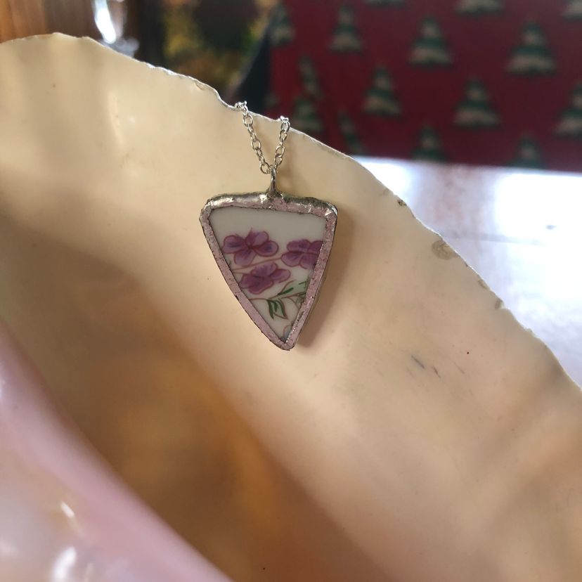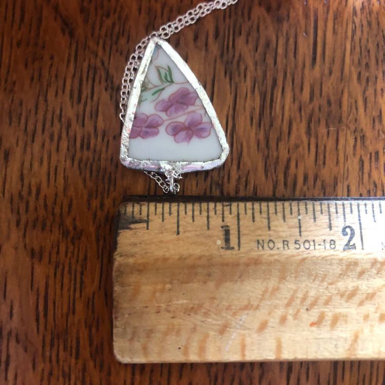 This charming pendant is a delightful piece crafted from broken floral plate, measuring 7/8" by 1 1/8". This necklace is uniquely handmade, turning a bit of history into wearable art. Perfect for adding a playful touch to any outfit, it’s a sweet way to carry a story around your neck!