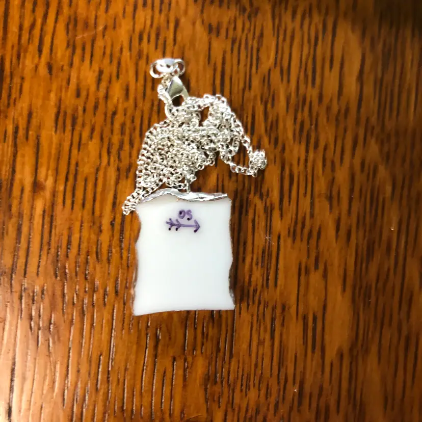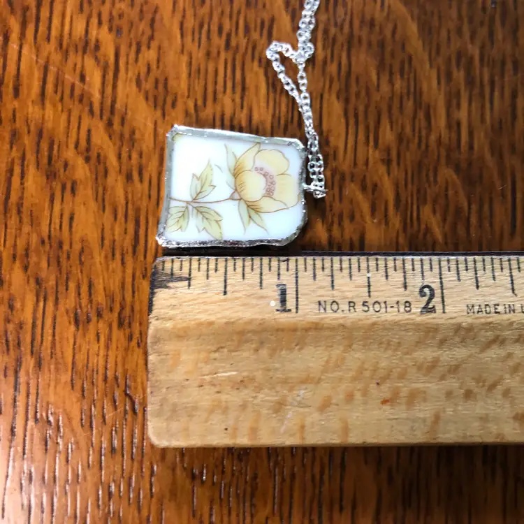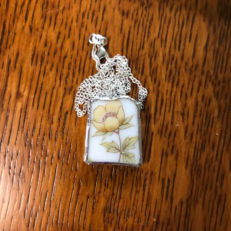Add a playful flair to your jewelry collection with this handcrafted pendant necklace made from a unique piece of broken pottery from a Japanese rose garden plate. Measuring 7/8in by 1in, this charming accessory brings a splash of history and whimsy to any outfit, perfect for those who love one-of-a-kind treasures!