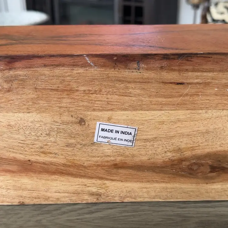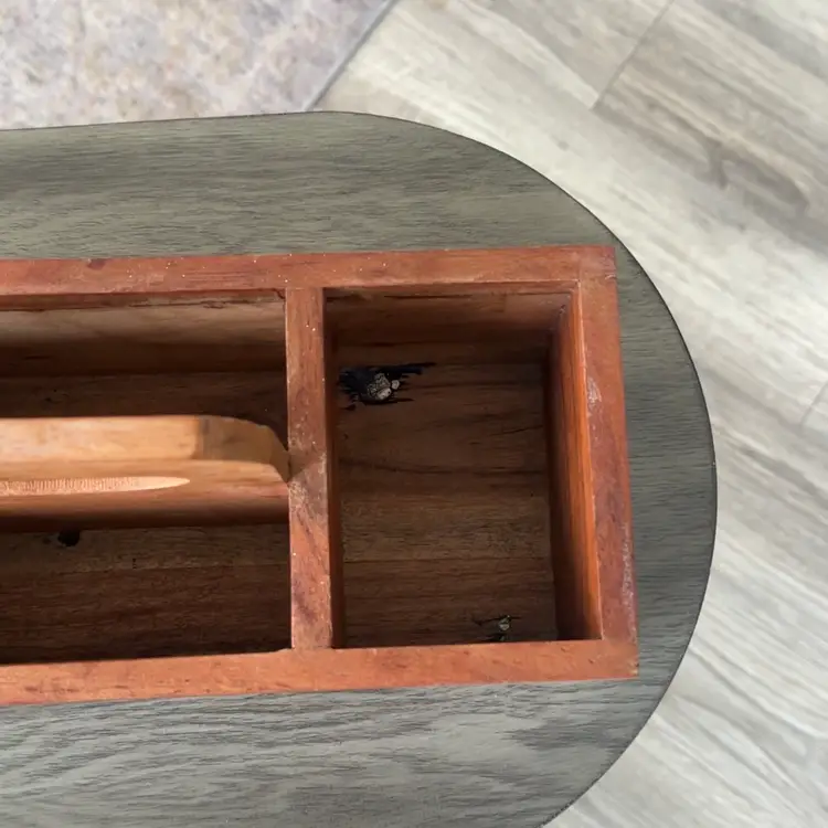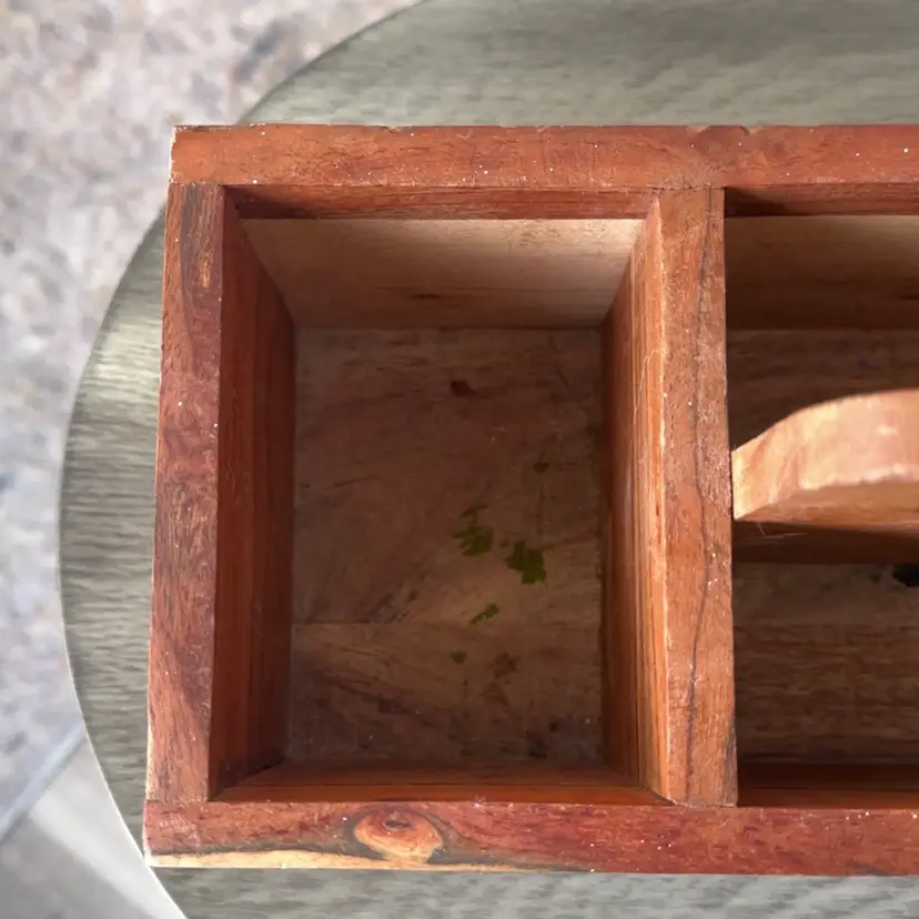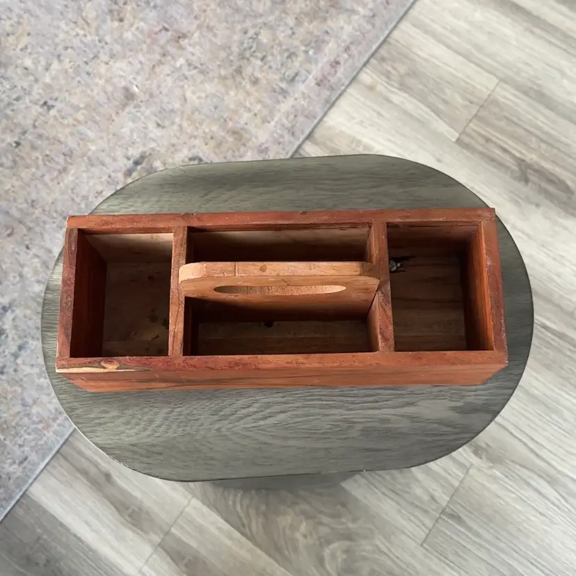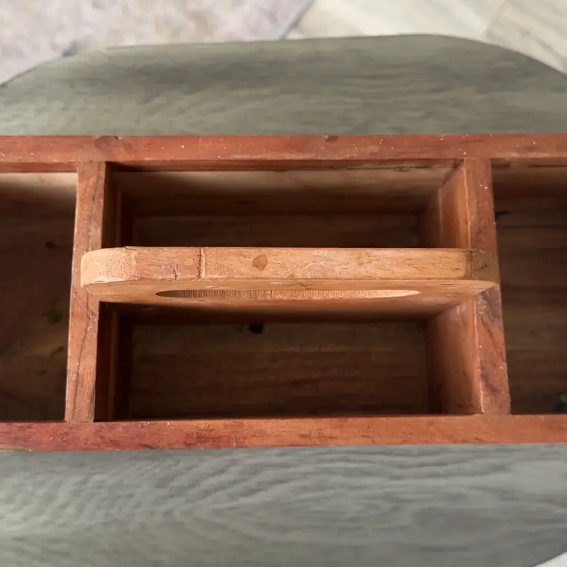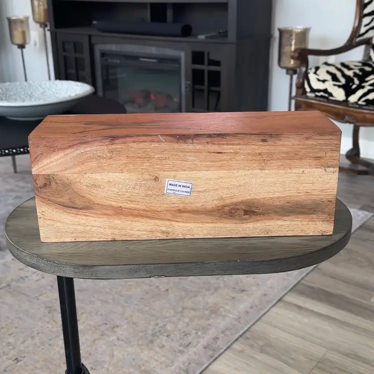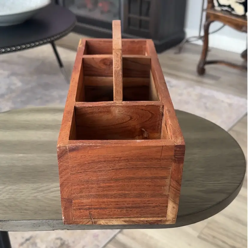 This handcrafted acacia wood cutlery stand is a stylish and practical addition to any kitchen or dining table. The rich brown color adds a touch of elegance while the sturdy acacia wood construction ensures durability. Perfect for holding knives, forks, spoons and other utensils. Its unique design and material make it a charming collectible piece for those who appreciate artisan craftsmanship. Please note that the inside is a bit stained as seen in photos. Measurements are 14x5x4.5”.