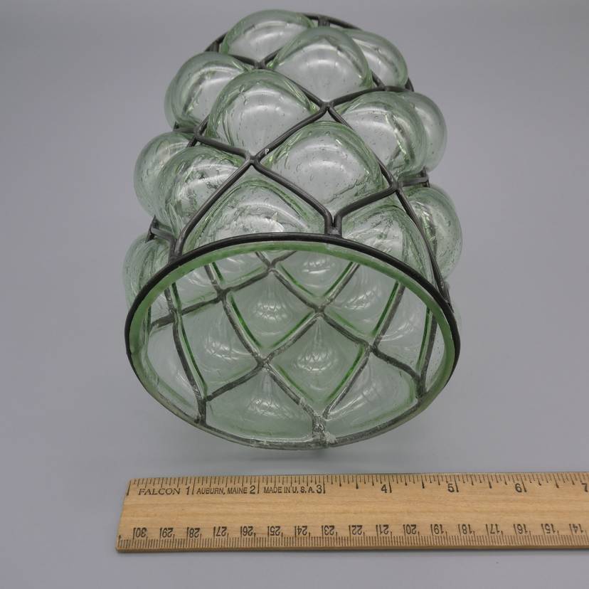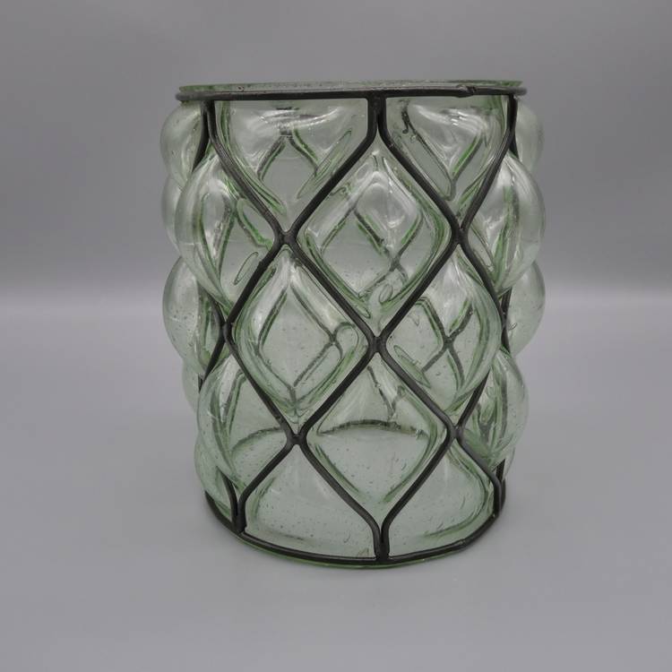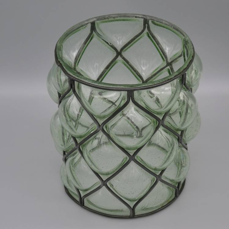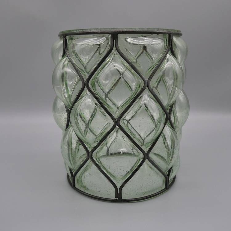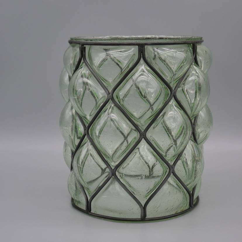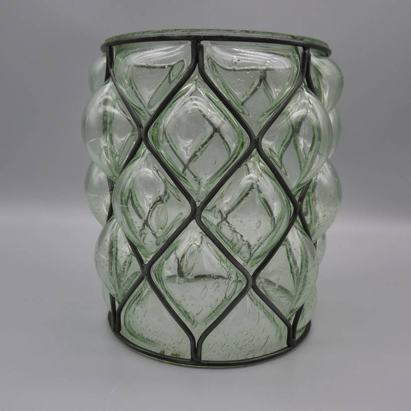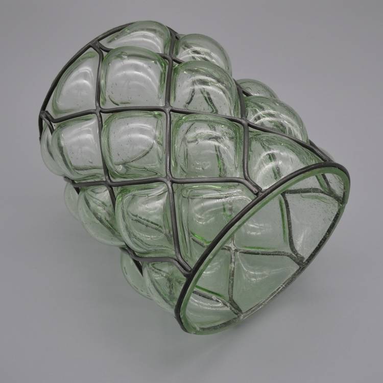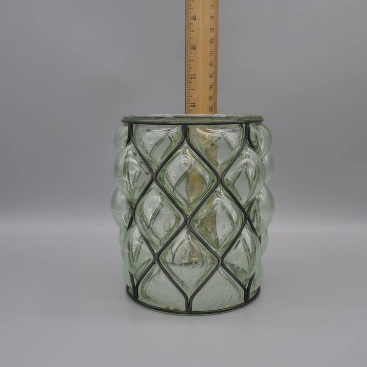 Featuring a candle shade that has had glass blown through a metal frame resulting in domed "bubbles" Hand-blown glass has seed bubbles throughout and is the color green of old Coke bottles Wrought iron framing Candle size use can vary from a tealight candle to about a 3" diameter pillar candle Measures overall about 5-3/4" tall x 5-1/4" wide at its widest x 4" diameter opening Weighs about 1 pounds 2 ounces before being packaged to ship