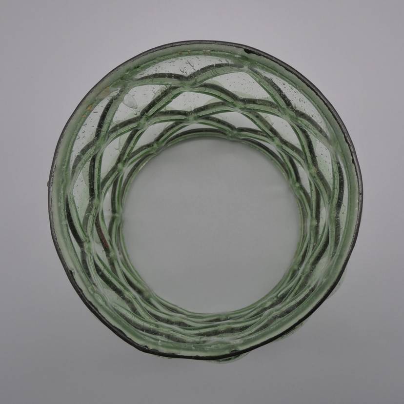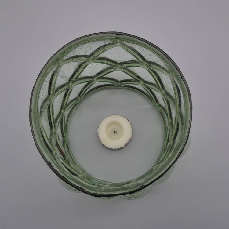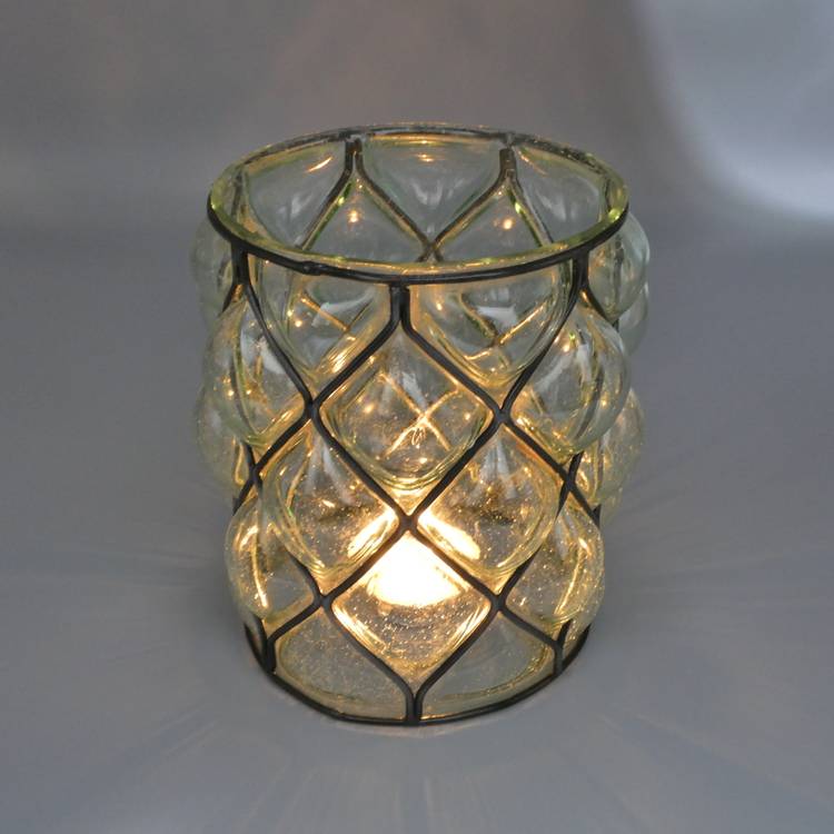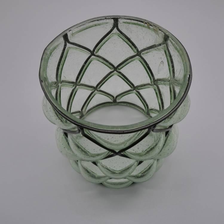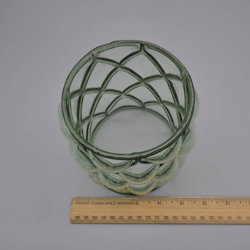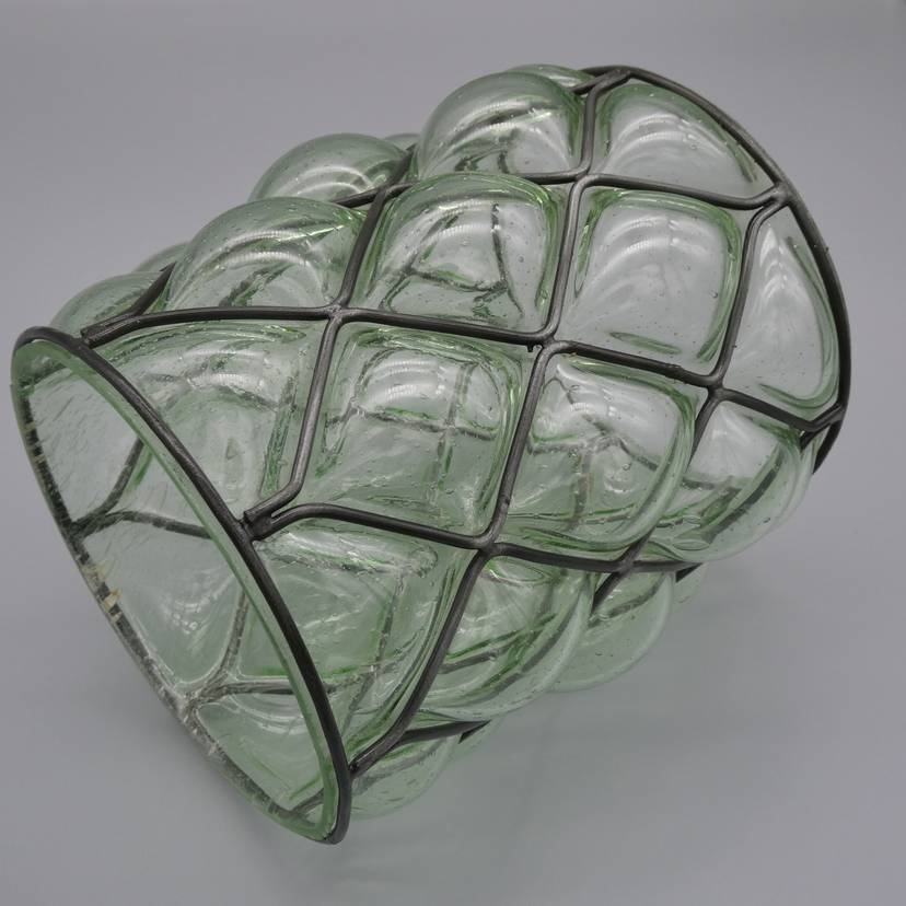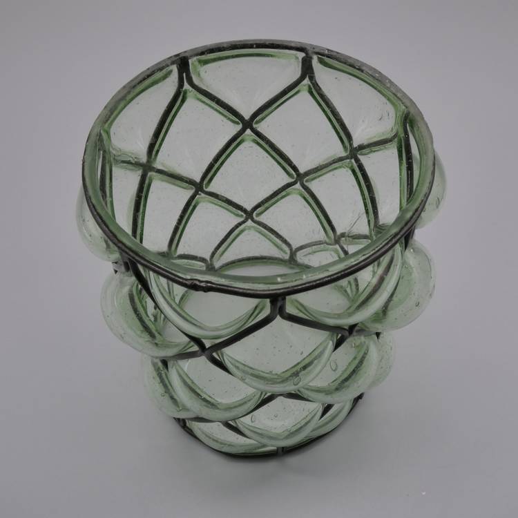 Featuring a candle shade that has had glass blown through a metal frame resulting in domed "bubbles" Hand-blown glass has seed bubbles throughout and is the color green of old Coke bottles Wrought iron framing Candle size use can vary from a tealight candle to about a 3" diameter pillar candle Measures overall about 5-3/4" tall x 5-1/4" wide at its widest x 4" diameter opening Weighs about 1 pounds 2 ounces before being packaged to ship
