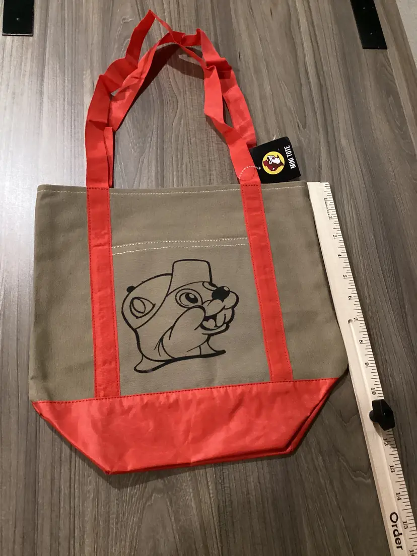 The Bucees Buc-ee’s Mini Tote Bag is a small, reusable red accent market bag with a brown exterior made of canvas. It features a tote style with red handles/straps, pockets for added convenience, and is designed for unisex adults. With dimensions of 13x10 inches (measurement is to the bottom when sitting flat), this mini tote bag is perfect for carrying essentials while on the go.