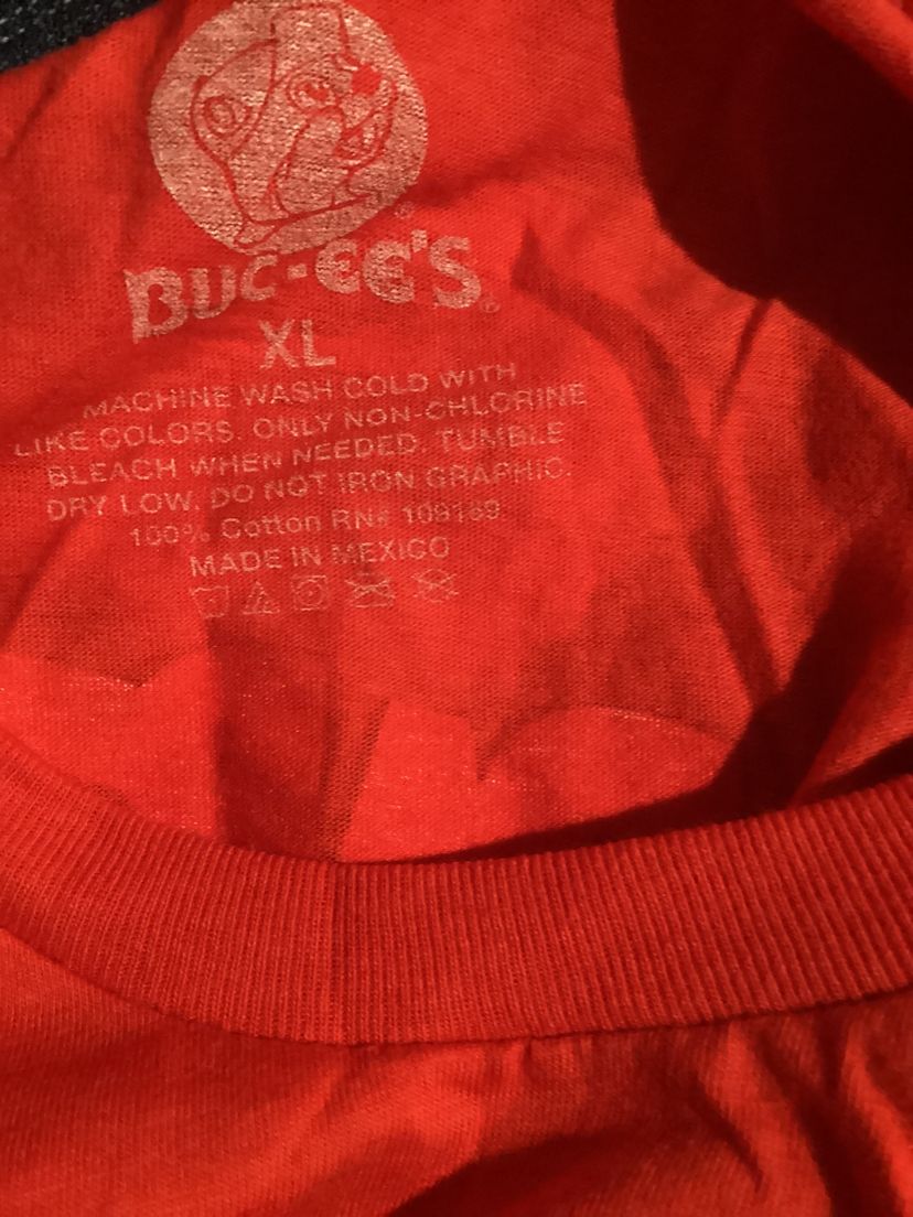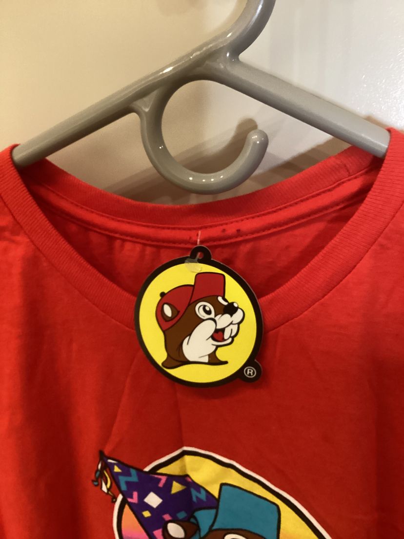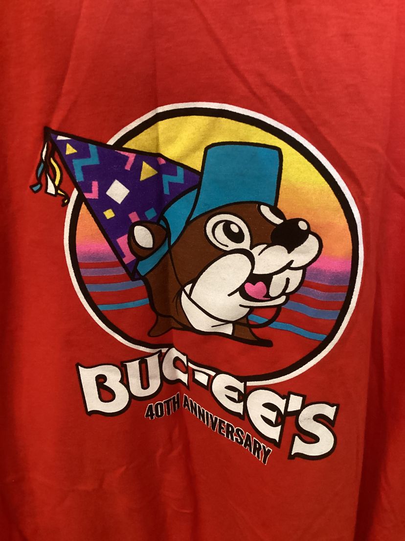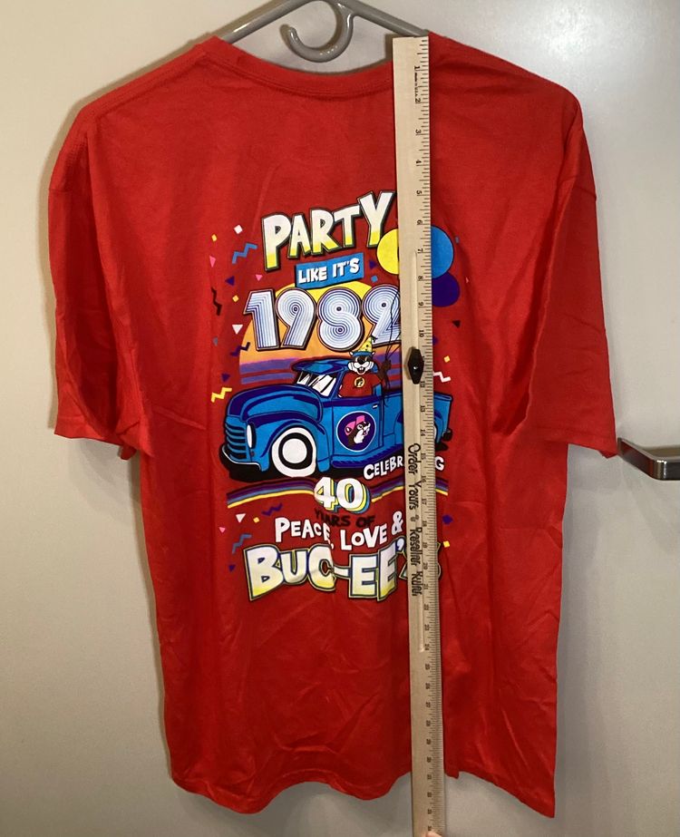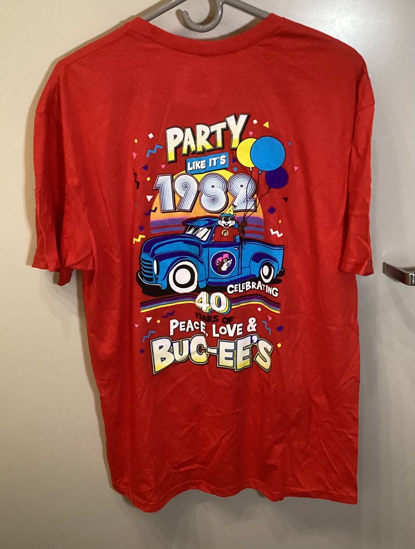 The Buc-ees Red XL 40th Anniversary Party Like Its 1982 Beaver Peace Love Shirt is a graphic print T-shirt featuring the iconic Bucees Beaver character. Made from cotton with a crew neck and short sleeves, this machine washable shirt is suitable for all seasons and is double-sided. The red color and woven fabric give it a classic look, perfect for men who appreciate USA-themed clothing with a touch of Bucees charm. Ideal for celebrating the brand's anniversary or just for adding a unique touch to your wardrobe. NWT New With Tags