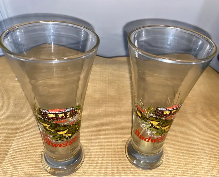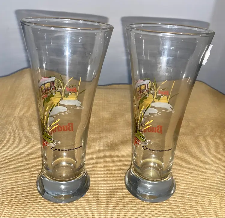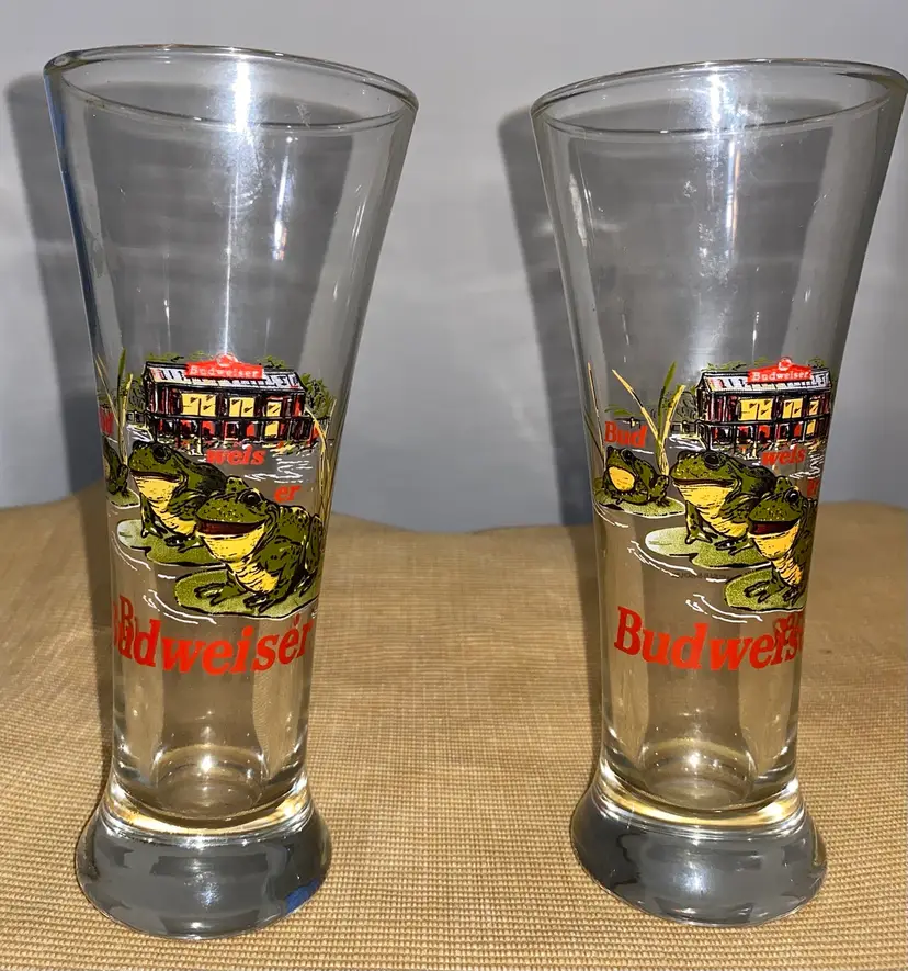 1996 Budweiser 2 glasses Bud Weis Er Frog 7.25 tall and 3” diameter at top. Flared. Nice condition