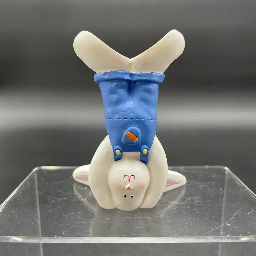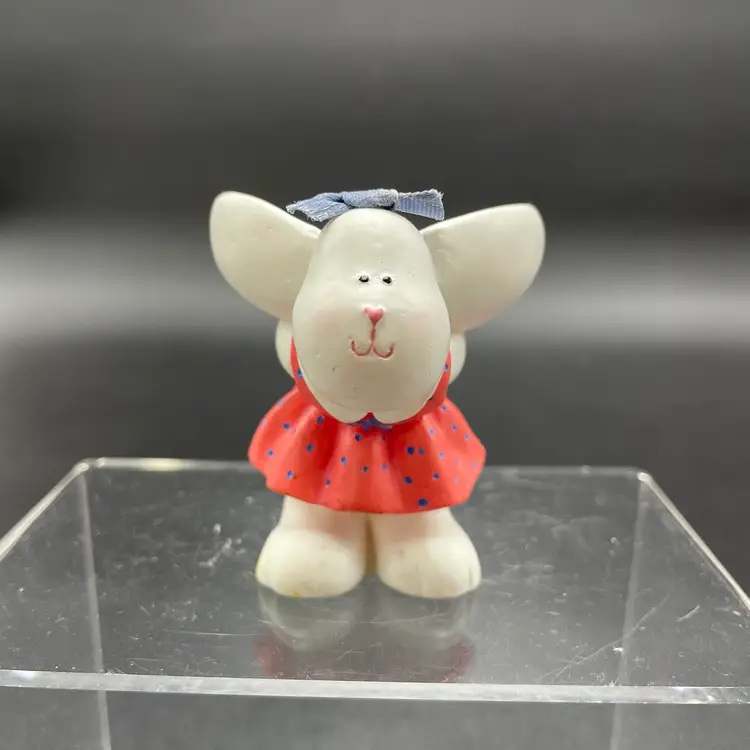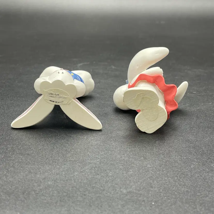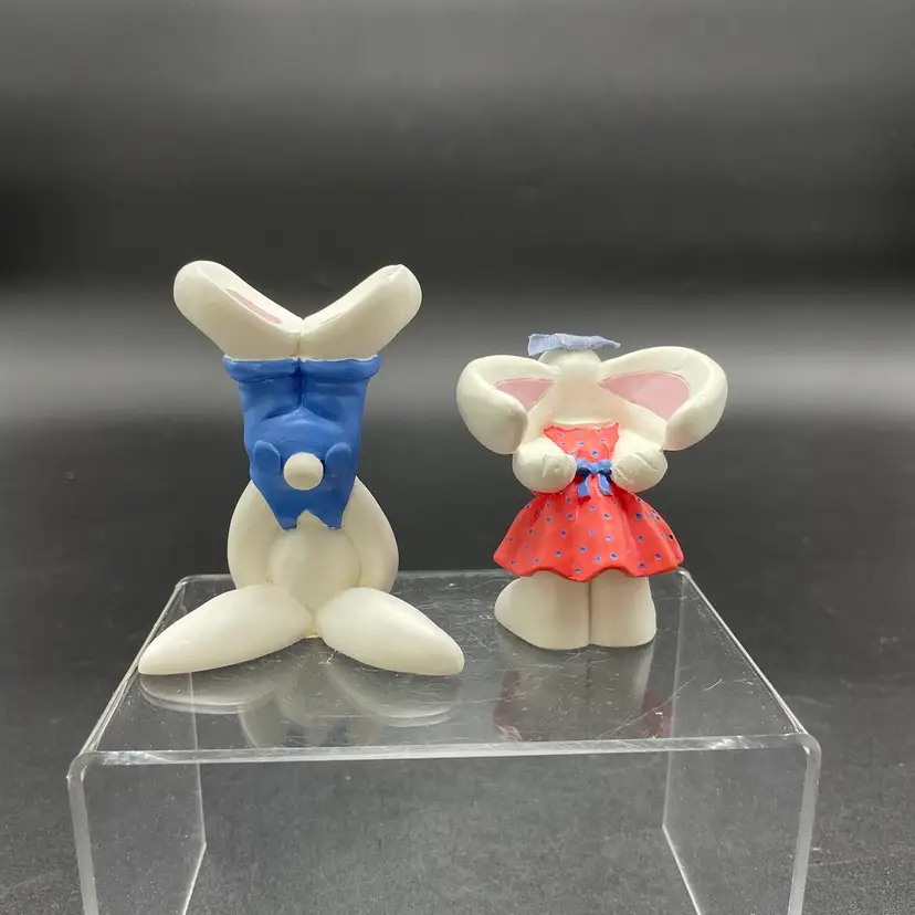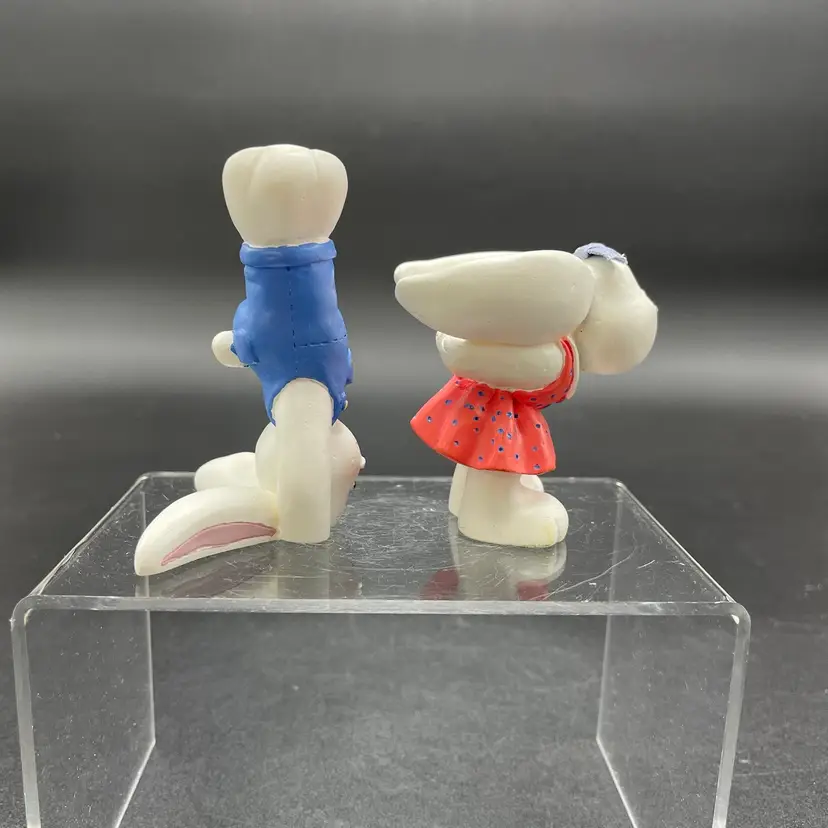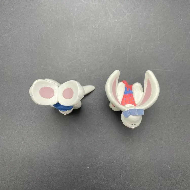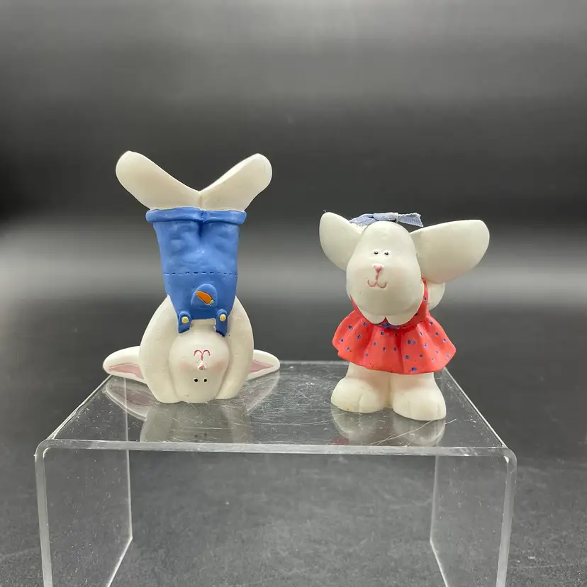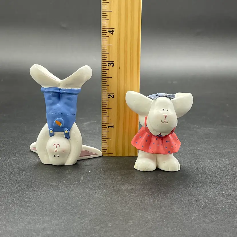 This is a set of 2 resin bunny rabbit easter egg holders. Set includes one boy and one girl. The boy measures approximately 3" tall and the girl measures approximately 2" tall. There is some light scuffing due to age and use. No other major flaws. Eggs not included.