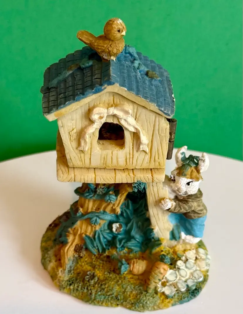It features a birdhouse with a small bird on top and a bunny rabbit character below. The figurine is made of resin or ceramic and is hand-painted