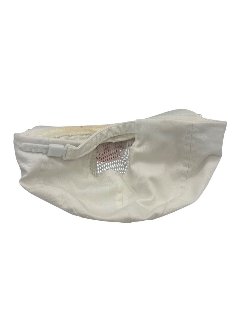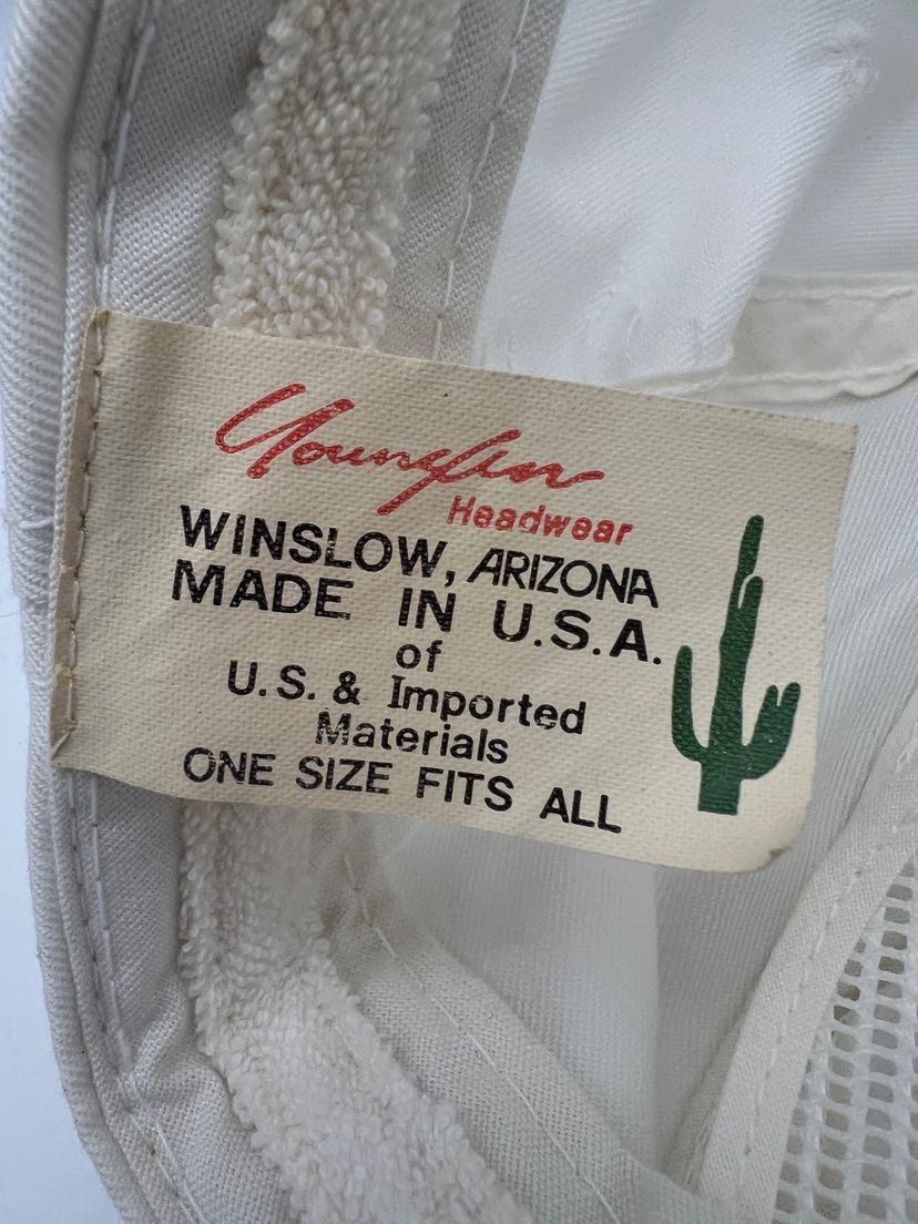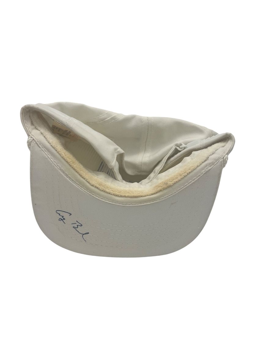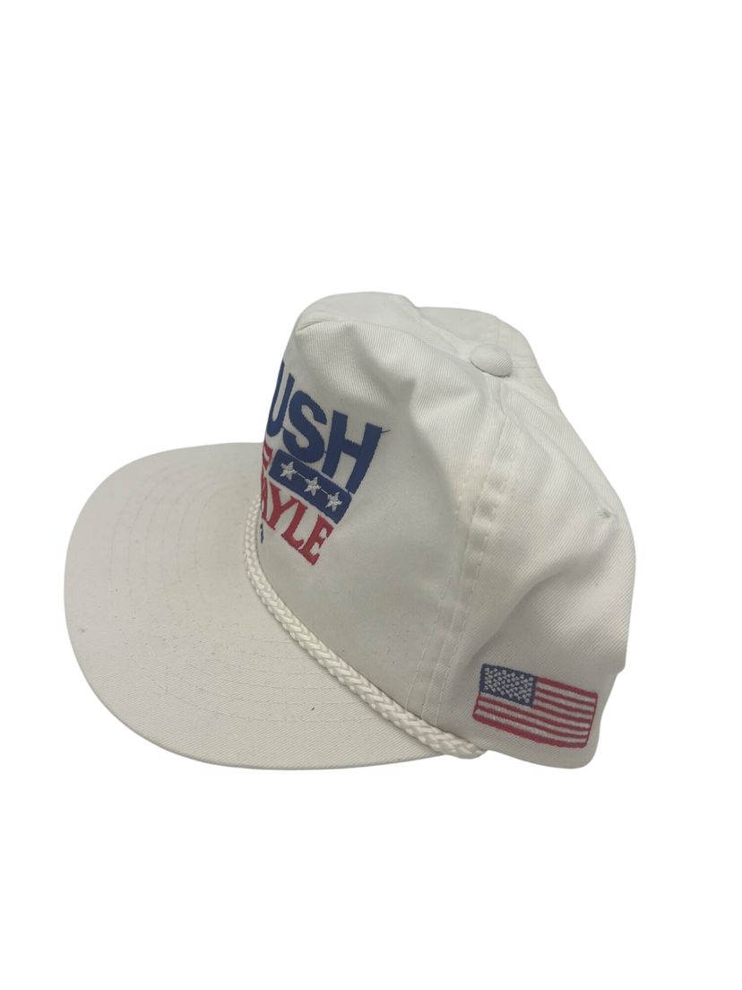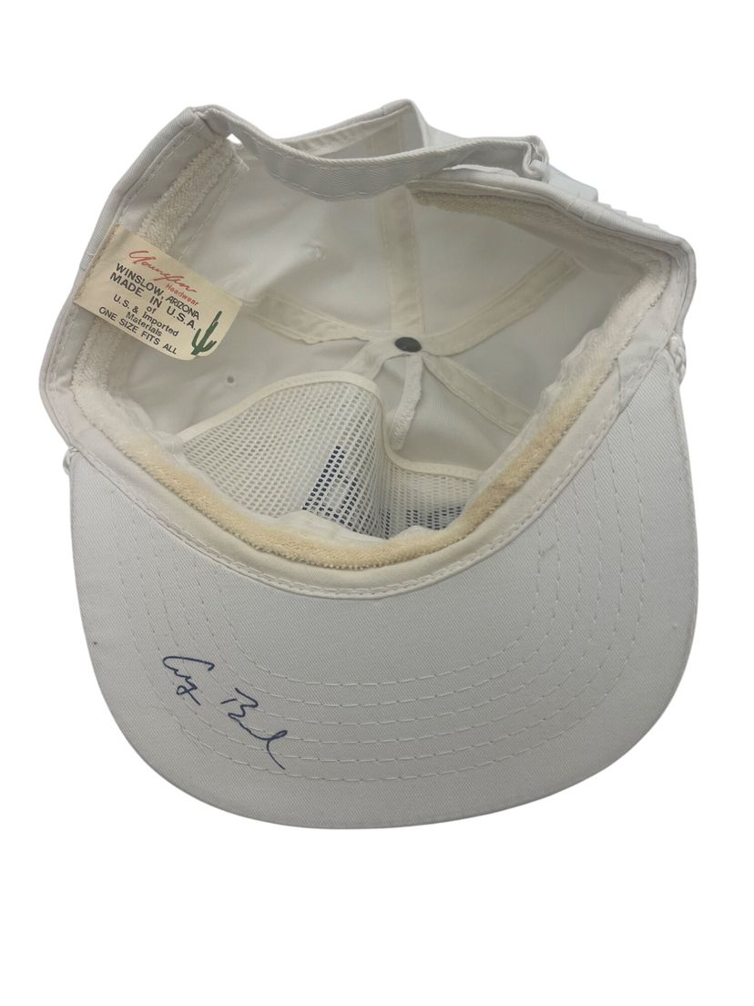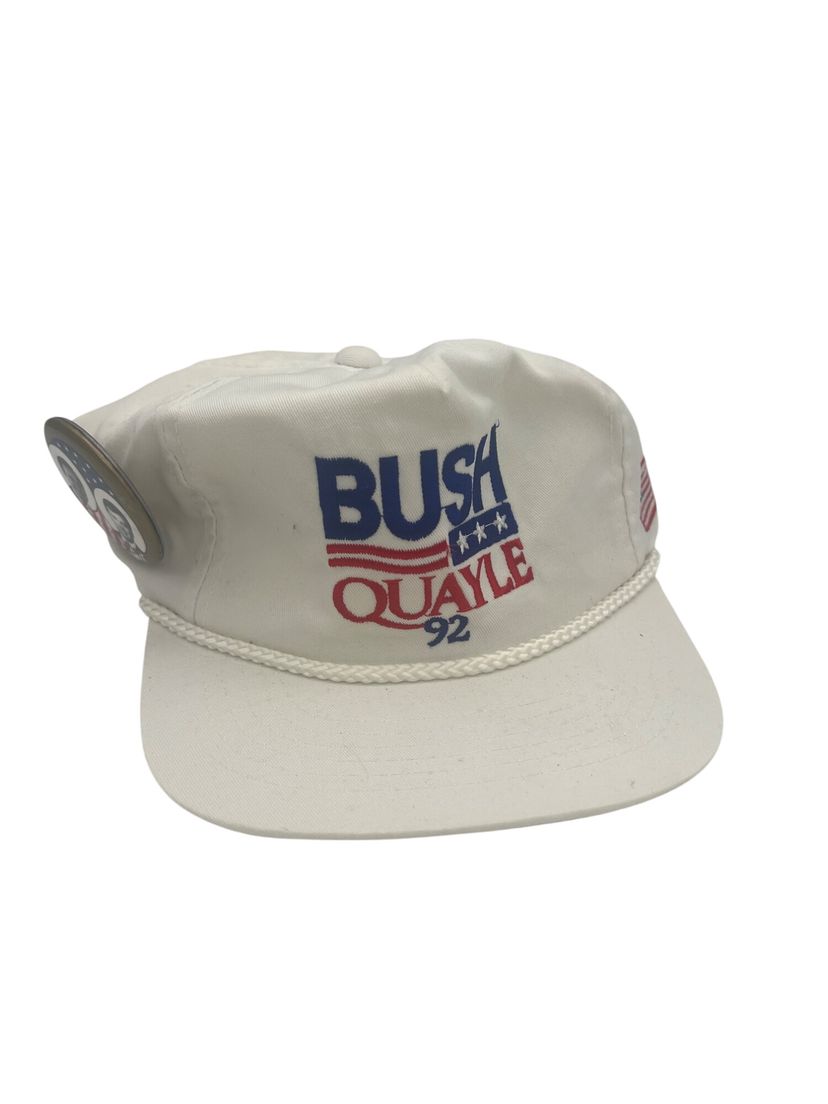 Original 1992 Bush–Quayle presidential campaign hat by Youngfin Headwear (Winslow, AZ). White twill crown and brim with braided rope cord; includes the matching Bush–Quayle campaign button. Inside of the brim has a blue-ink autograph that appears to read “George Bush” (not authenticated) One size fits all. Made in USA.