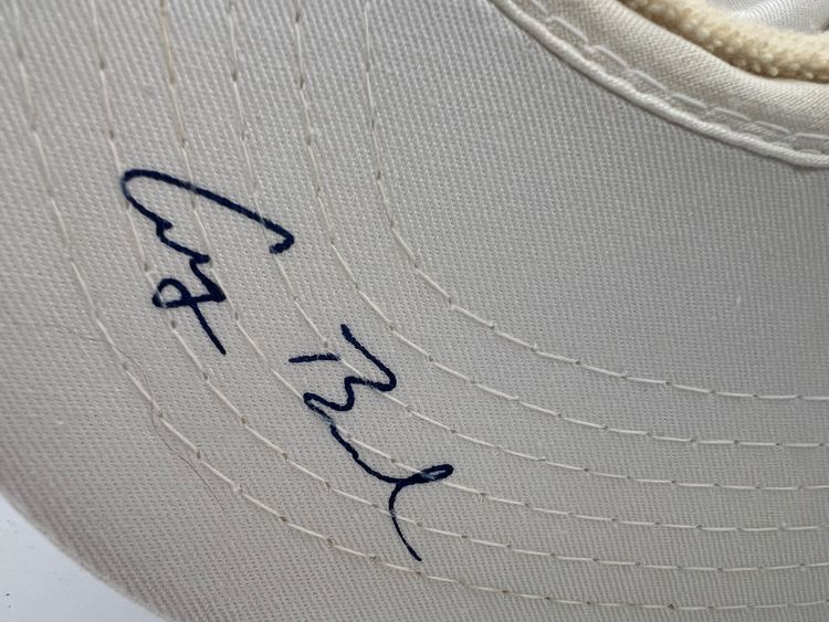 Preowned with light marks on crown/brim and sweatband discoloration; structure is sound and the button is present. Sold as found; signature unverified. See pictures for further details on condition.