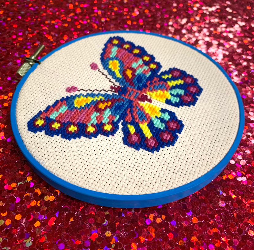 This vibrant folk art butterfly measures is hand-stitched on light pink aida cloth, and secured in a blue bamboo hoop. Measures 5" across. This is a completed item, ready for shipment today!
