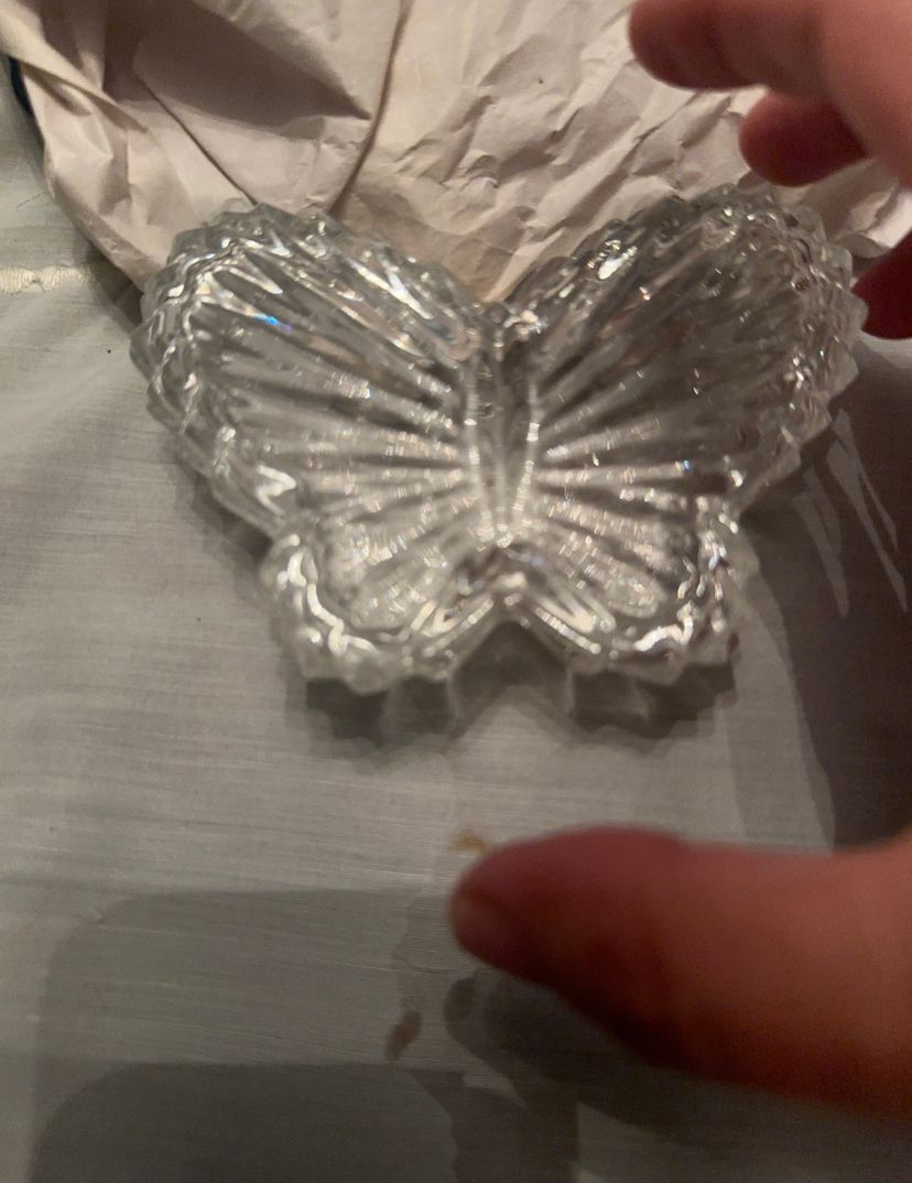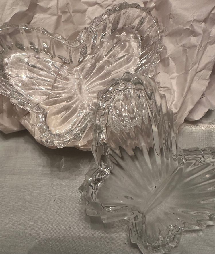 REDUCED! The Butterfly Shaped Crystal Trinket/Jewelry Box with Lid is a beautifully crafted decorative collectible made of clear glass. It features a unique butterfly design, making it a charming and elegant addition to any collection or display. The clear glass material allows for easy viewing of the contents inside, while the lid ensures that they are kept secure. This trinket/jewelry box is perfect for storing small treasures or jewelry and adds a touch of sophistication to any room decor.
