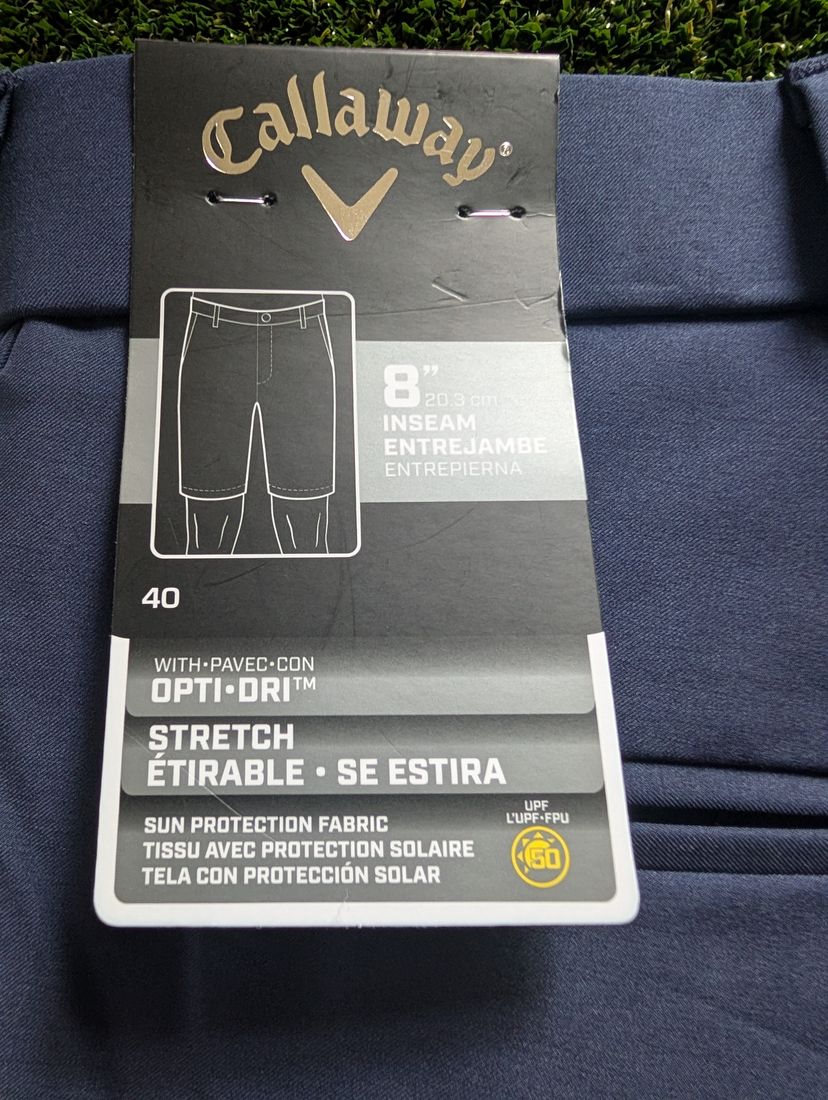 Navy blue Callaway golf shorts with opti dri, stretch fabric and an 8" inseam size 40