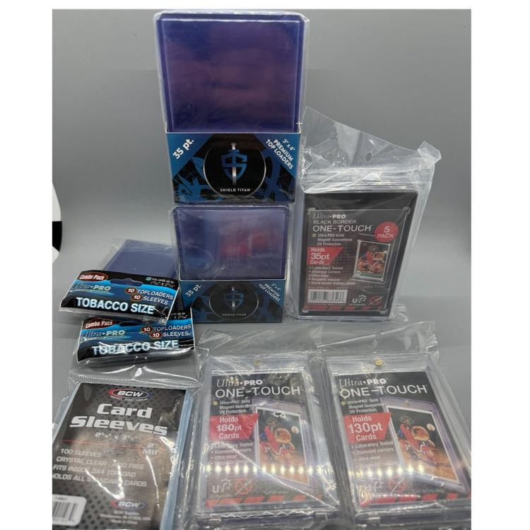 2 - 35pt top loaders 2 - tobacco size combo packs (10 top loaders, 10 sleeves) 1 - 100 pack of 2mil card sleeves 1 - 5 pack of 35pt black boarder one-touches 1 single 130 pt one touch 1 single 180 pt one touch