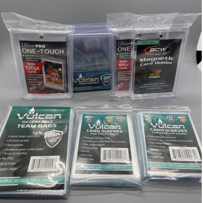 1 - 35pt 25 pack top loaders 1 - team bags pack 1 - thick card sleeves pack 1 - regular card sleeves pack 1 - 180 pt one touch 1 - 130 pt one touch 1 - 75 pt one touch