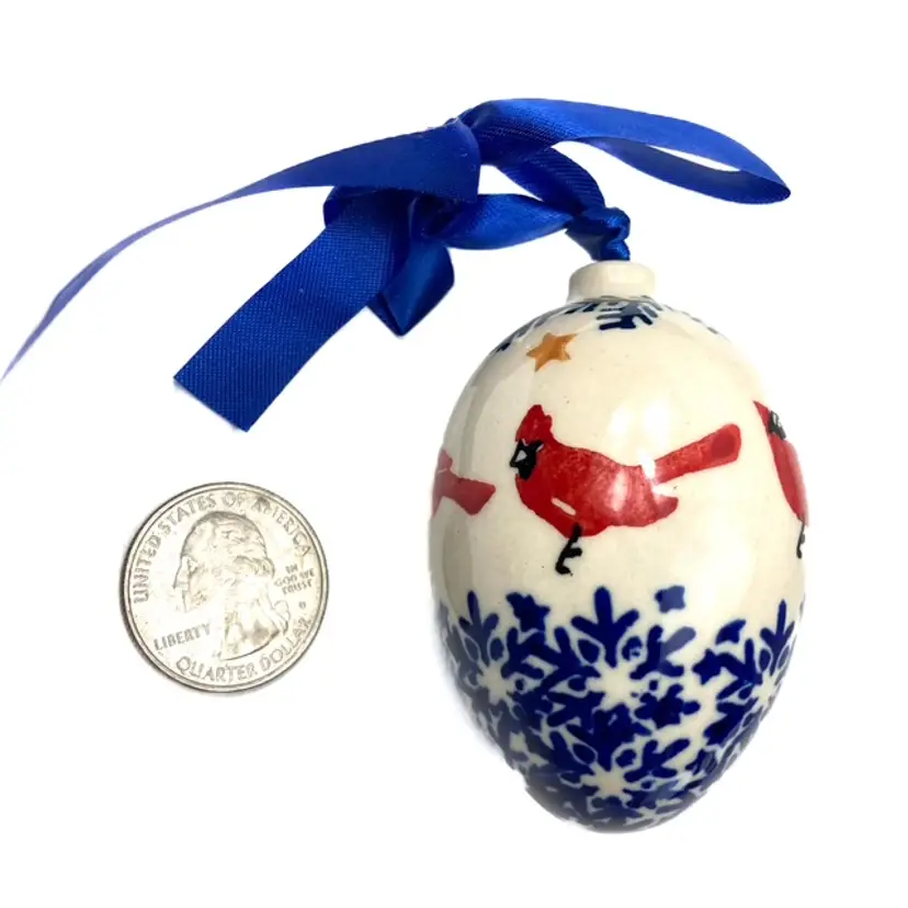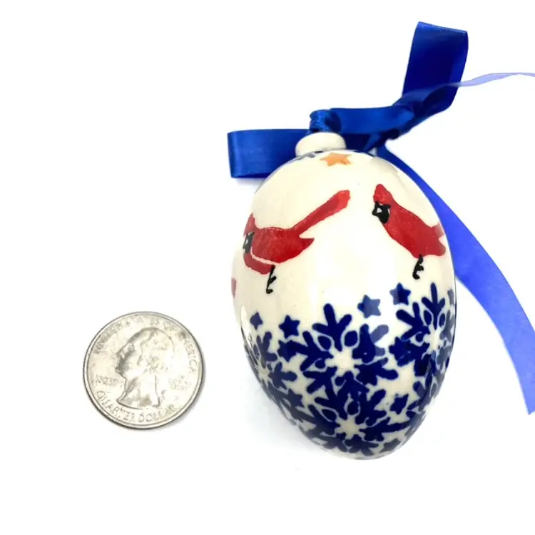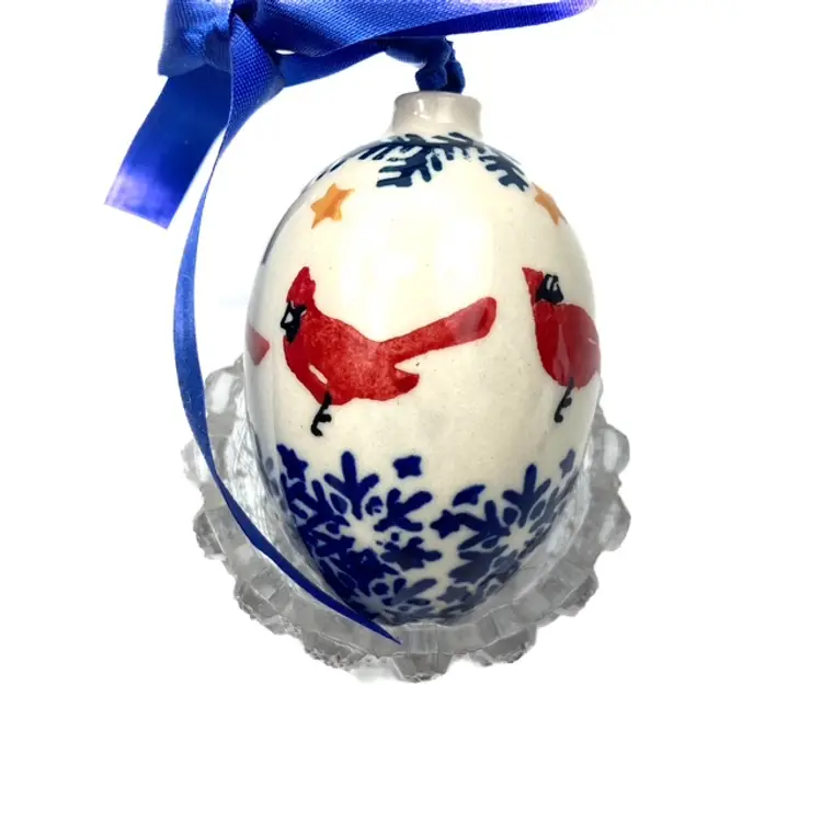 This handcrafted and hand painted egg shaped ornament features a festive design of stars, cardinals and snowflakes. Made in Poland, this tree decoration is approximately 3” tall, and is about 1.5” wide. No chips or cracks noted. Please note, had crafted items may have dimples, roughs and/or fine scratches. (Stand not included) mar1538