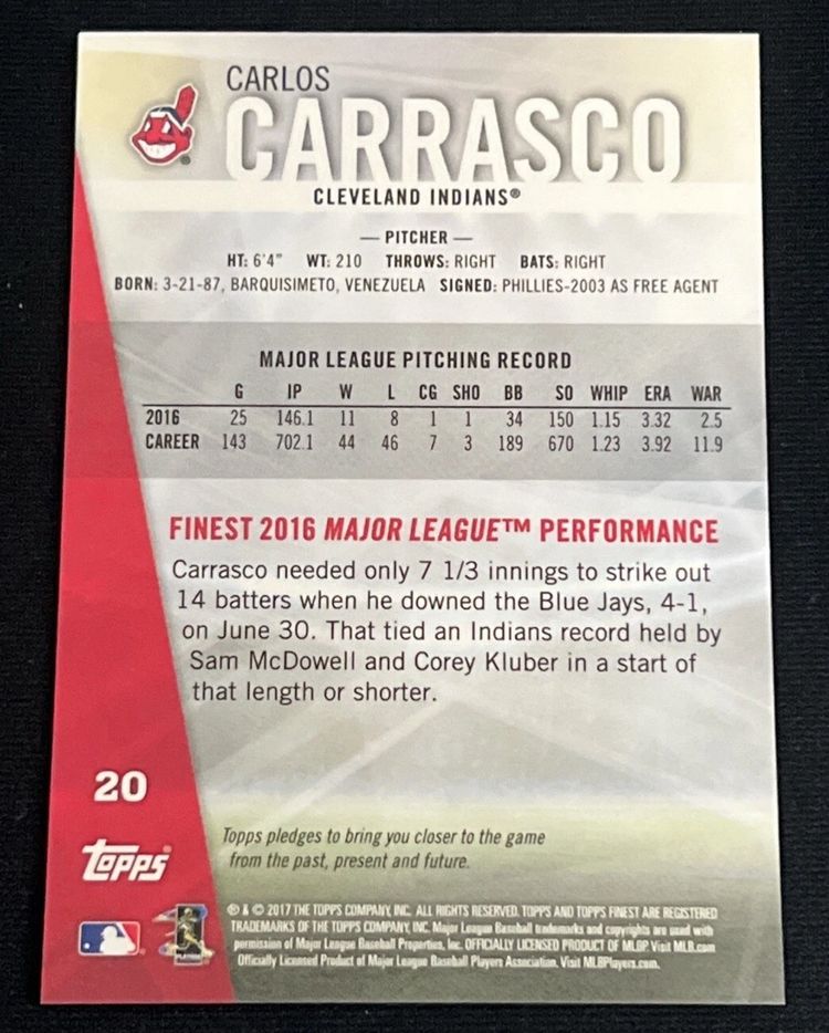 Carlos Carrasco 2017 Topps Finest Gold Refractor /50 #20 Indians Cleveland Guardians