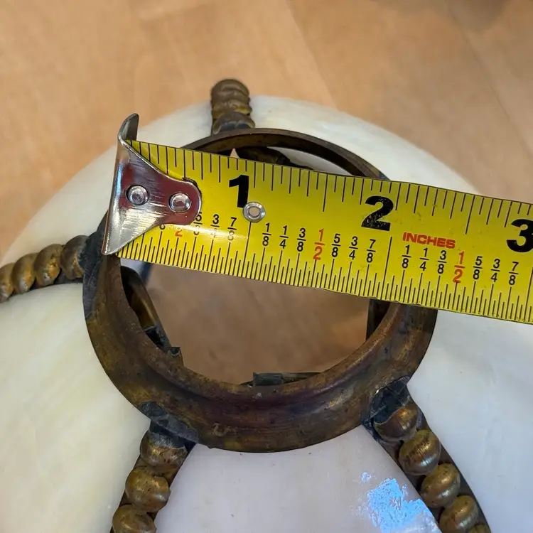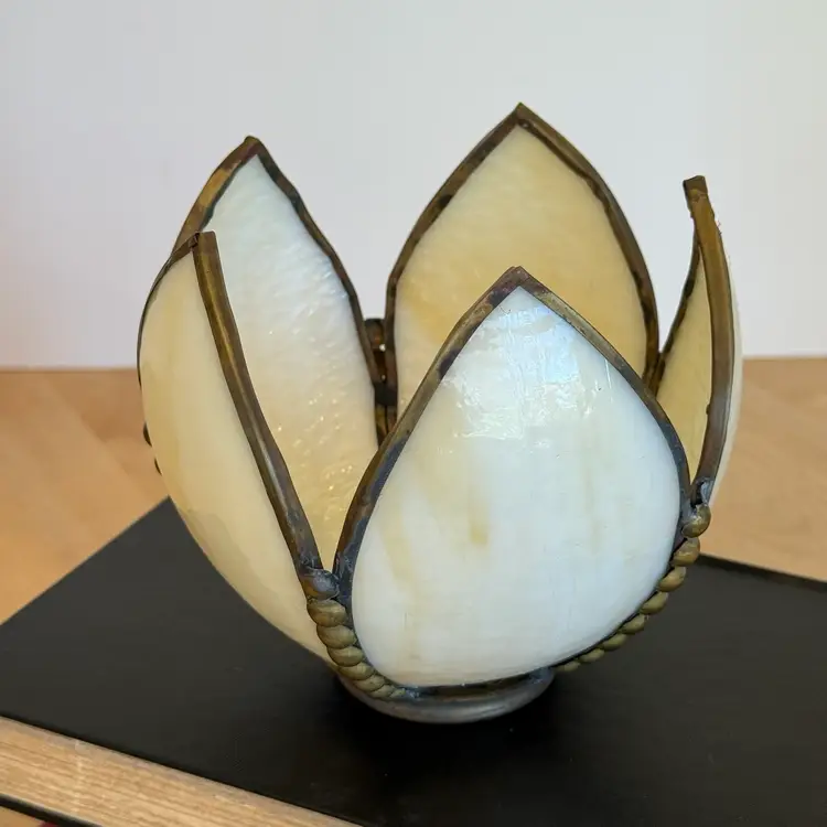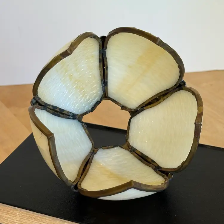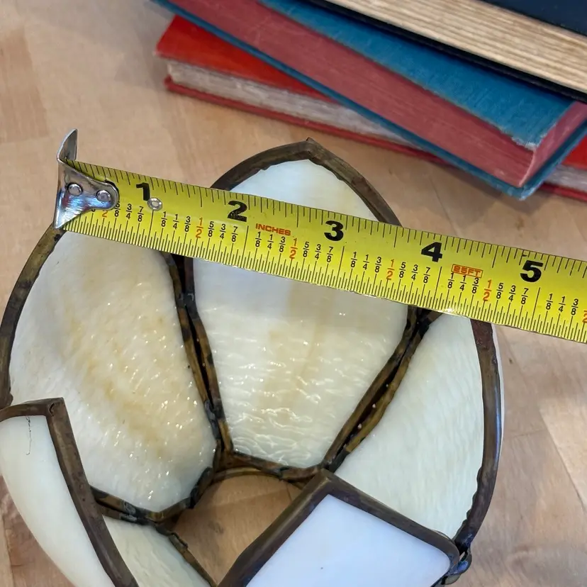 Slag glass lamp shade globe with a 5 panel tulip design. Made of glass, this shade adds a touch of vintage charm to any room. Although the maker is unknown, this unique and decorative piece is sure to be a standout feature in any antique collection.