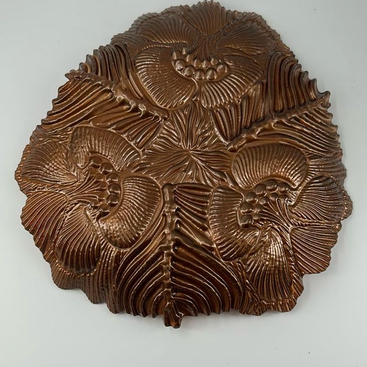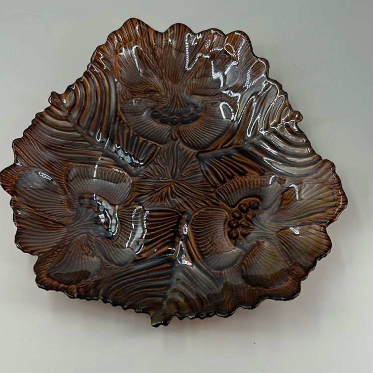 This is a set of decorative carnival glass dishes. These plates are characterized by their iridescent machine and involves designs. I am selling them individually. The colors are variable, including green, gold, brown, and Amber. They measure 7 inches tall and almost 8 inches wide.