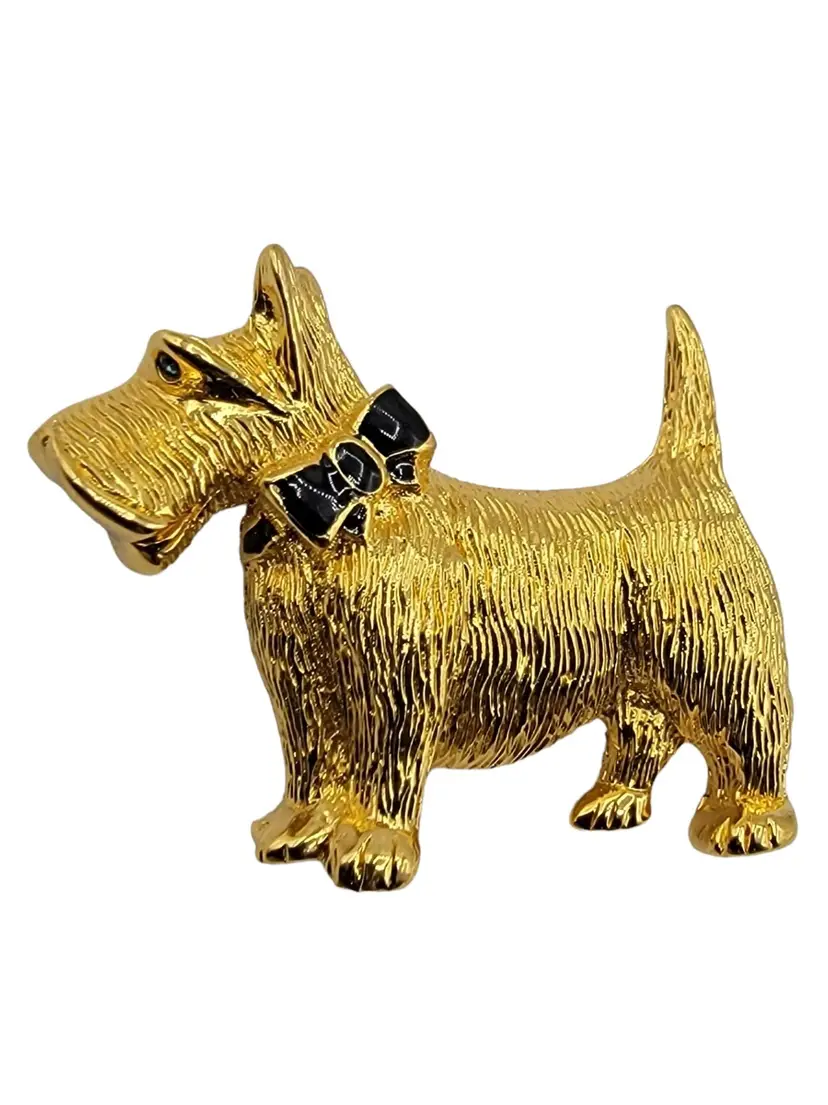 Carolee Vintage Black Enamel Bow Gold Tone Scottie Dog Brooch, Signed