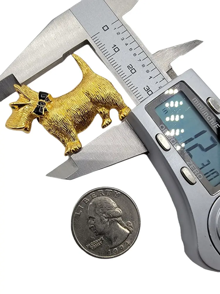 A beautiful brooch features a Scottie dog figural in gold-tone base metal with a black enamel bow on its neck and black rhinestone eye. This mid-century pin shows a deluxe finish that enhances its beauty and craftsmanship. It measures approximately 1.2-inches tall. Marked CAROLEE © on reverse. The pin at the back functions properly and is in good vintage condition.