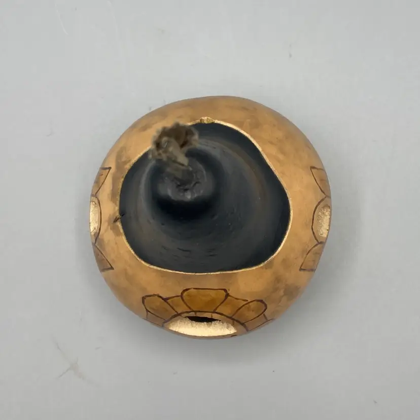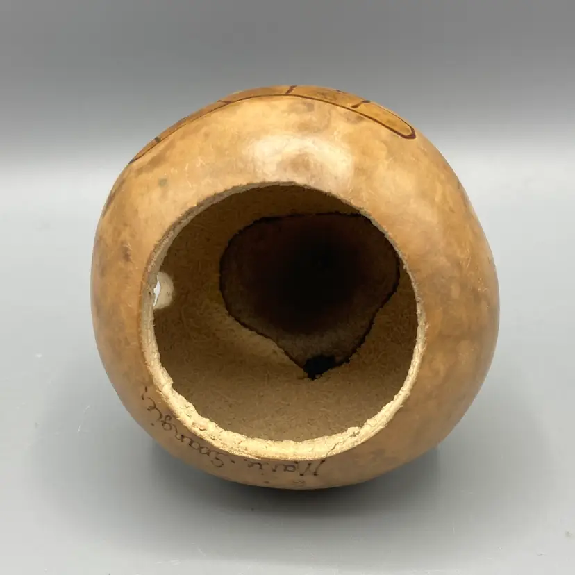 This gourd is in good overall condition. It is signed Marie Spangler and would be perfect for a fairy garden or to put a little battery-operated tea light under. It measures approximately 5" tall x 3".