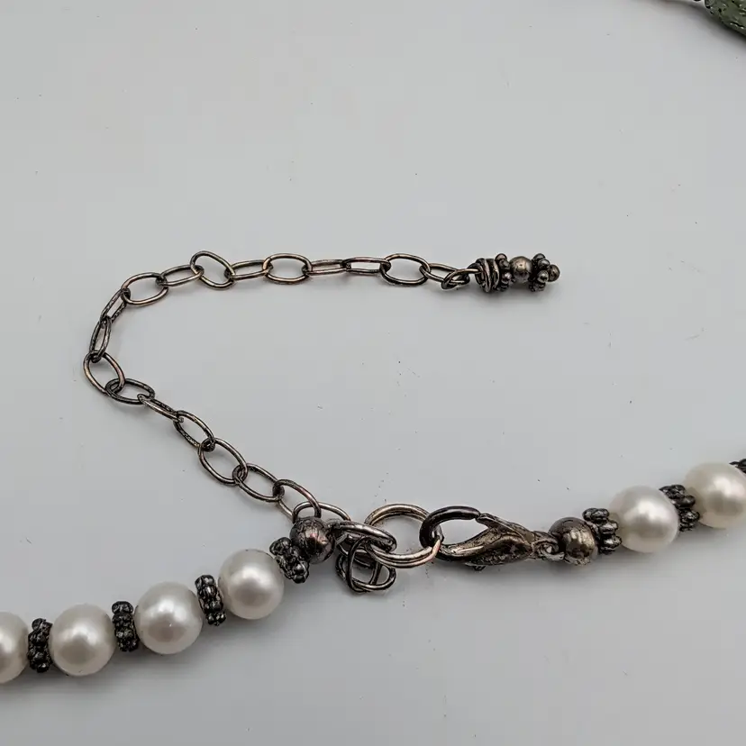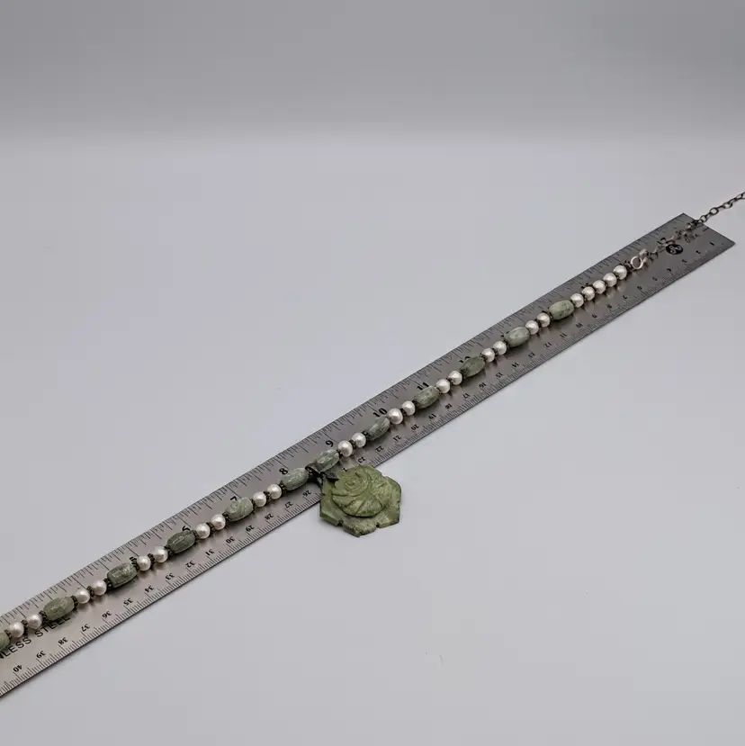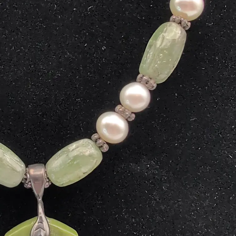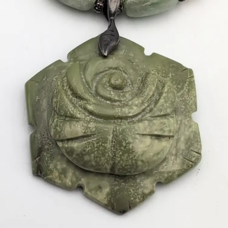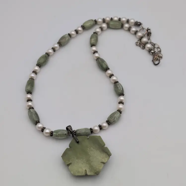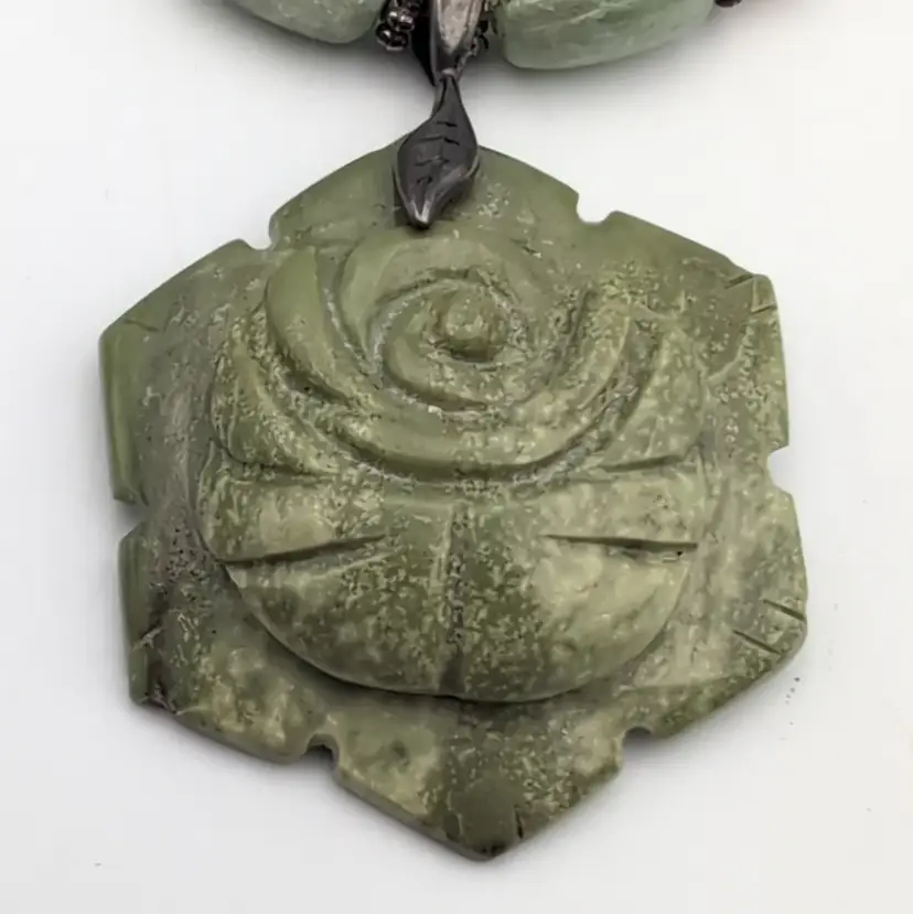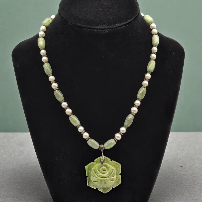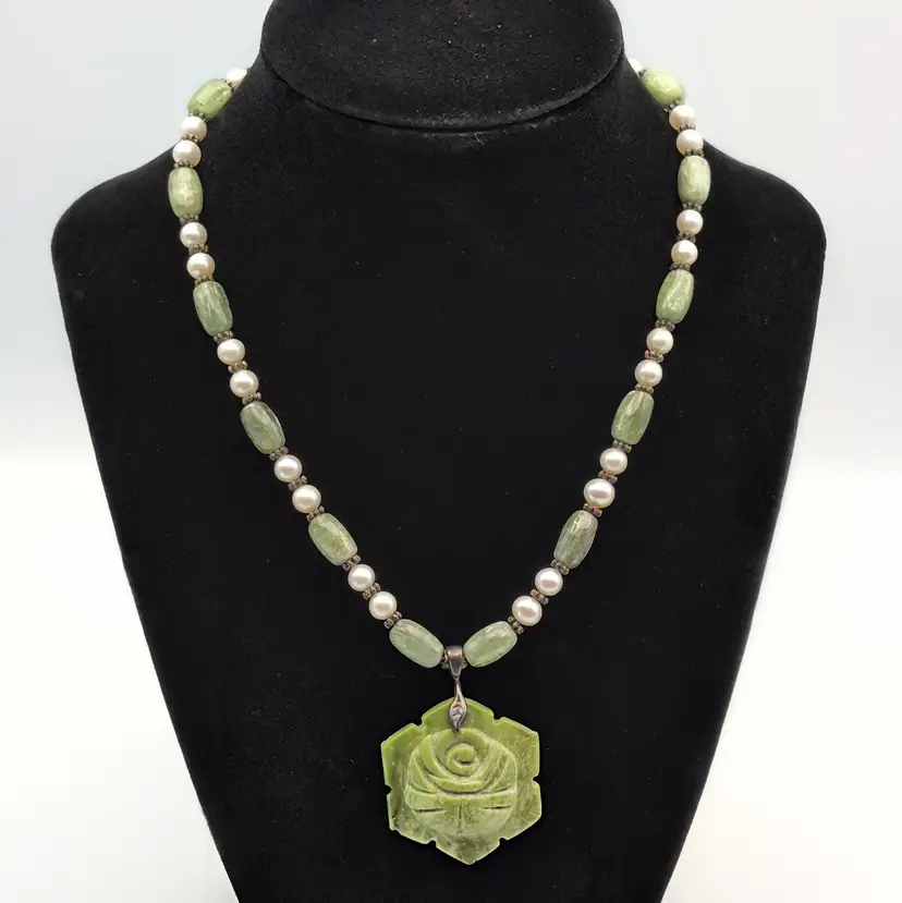Carved Soapstone Rose Flower Pendant Freshwater Pearls Green Kyanite Necklace
