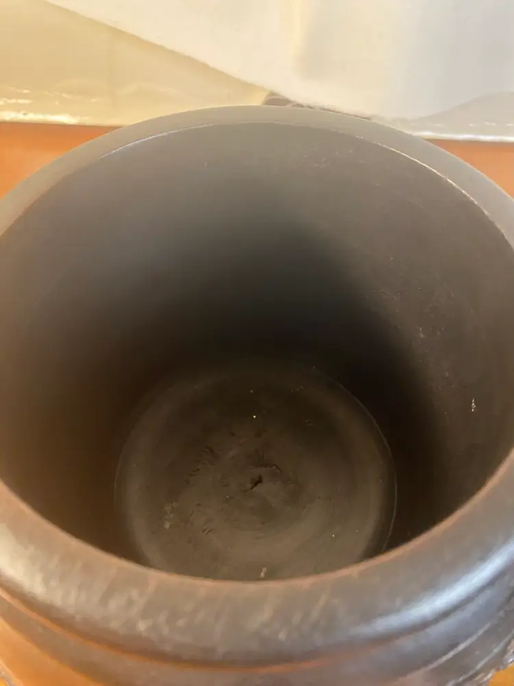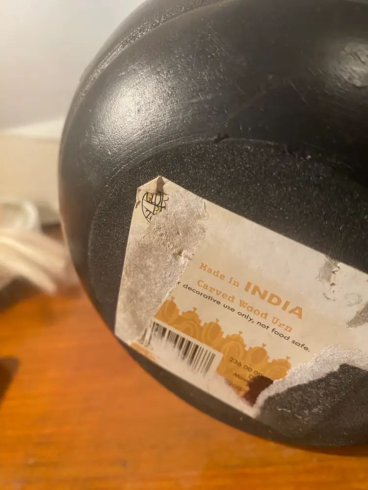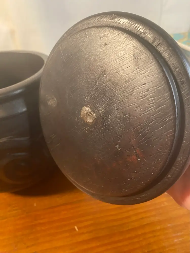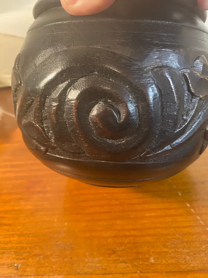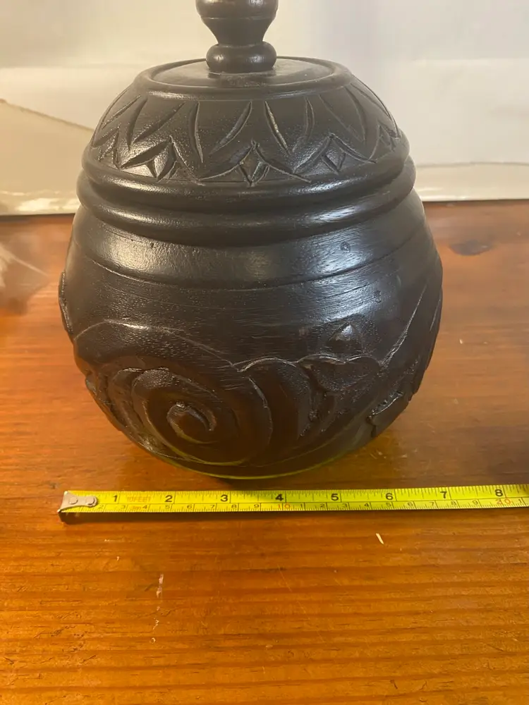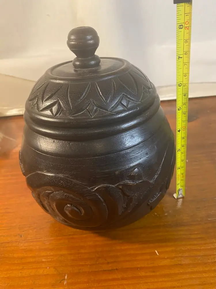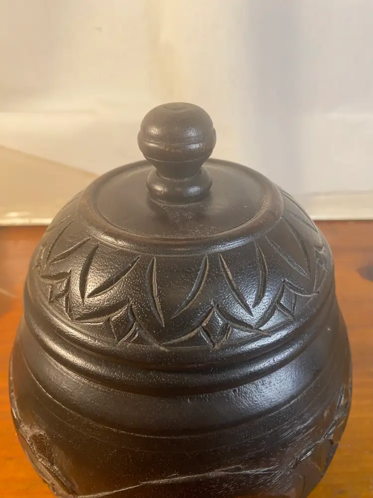 Carved Dark Wood Round Jar, Boho or Tribal style, 8 inches tall