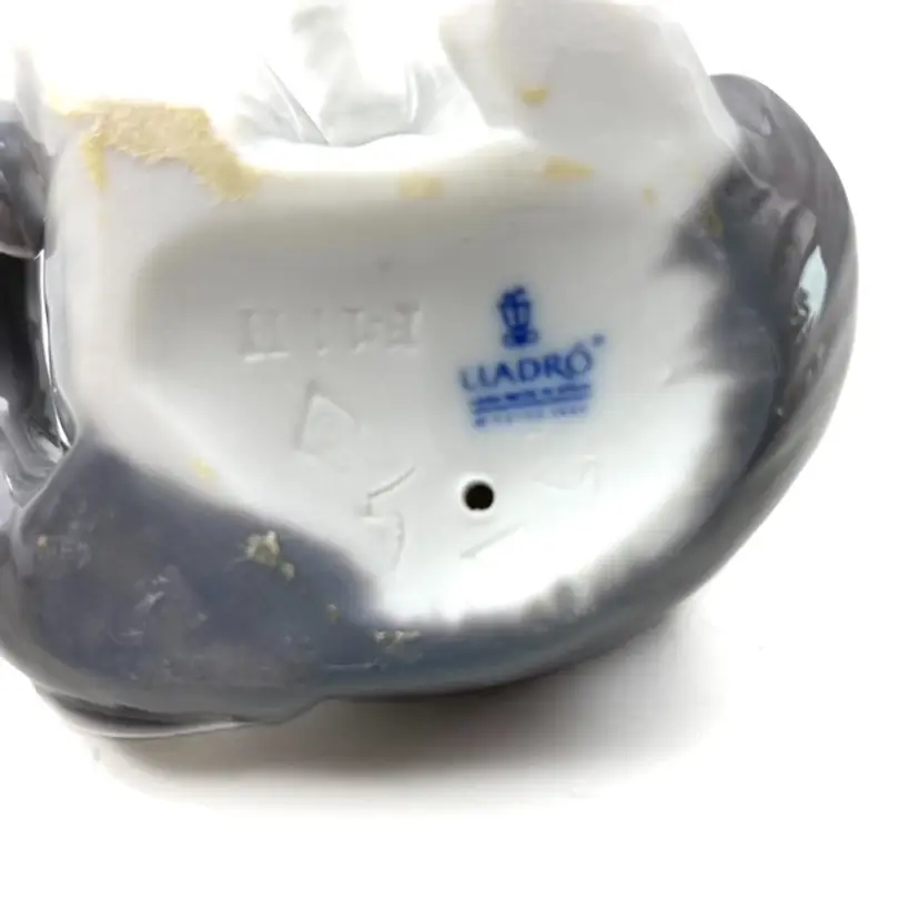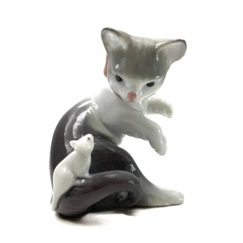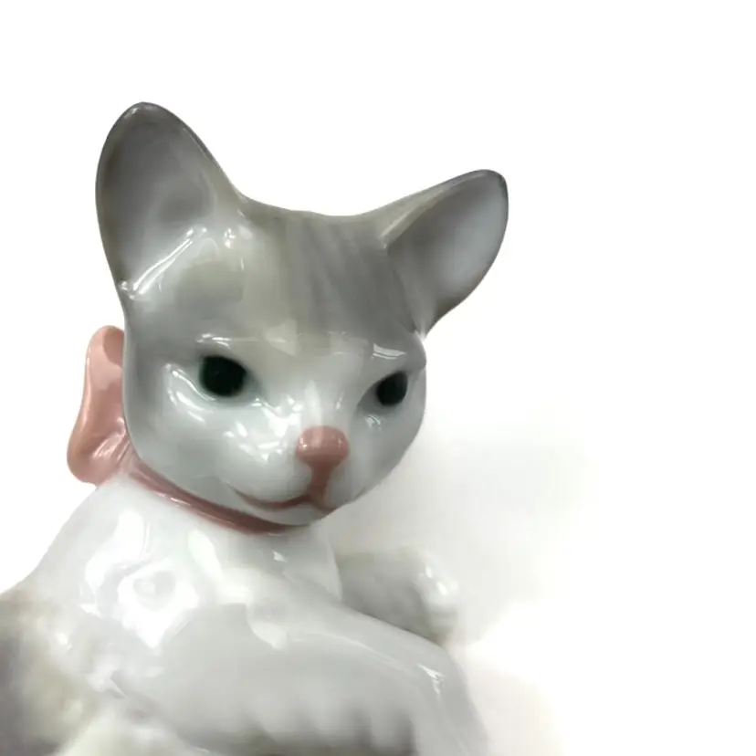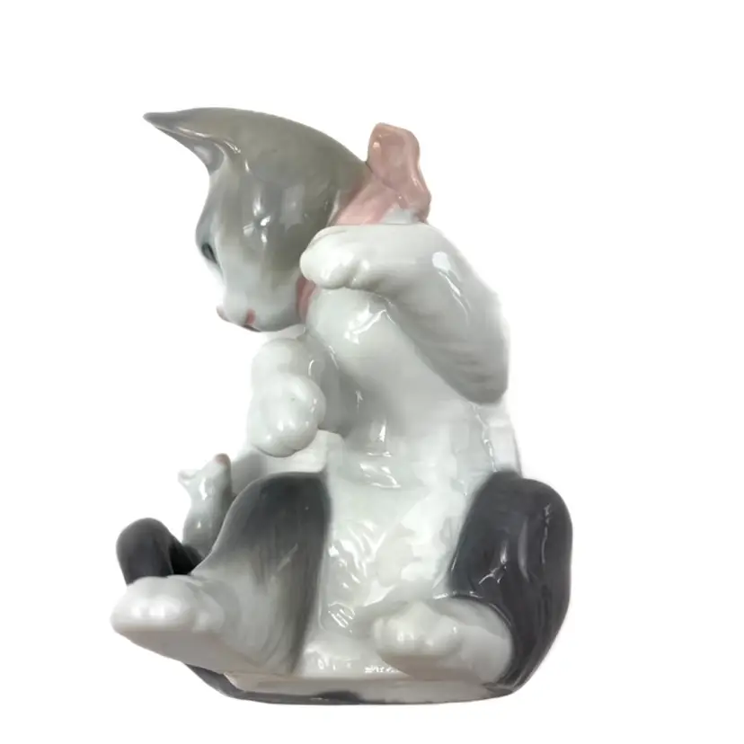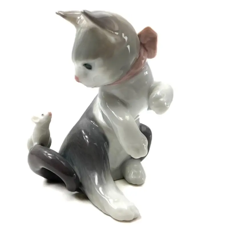 Vintage Lladro kitten with mouse circa 1986 attributed to sculptor Juan Huerta. Kitty with it's big pink bow is about 3" tall, 2.5" wide and 2.75" deep. Marked F11H , most likely #8114. Original box not included. mar1530