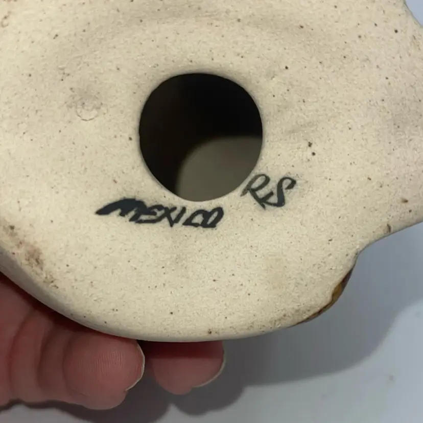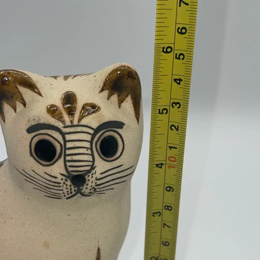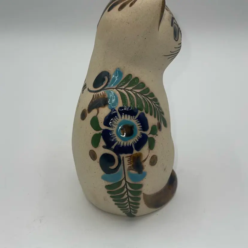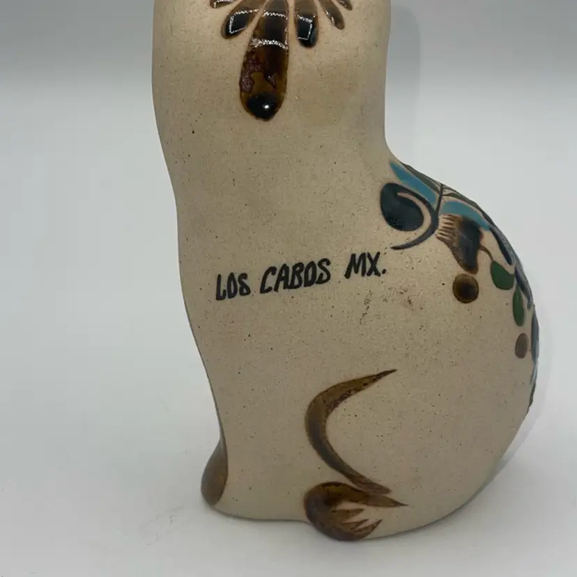 It is signed Mexico and the initials of the artist on the bottom on the back it says Los Cabos Mexico please see the pictures. This is a beautiful cat with a floral design going down. It’s back no damage noted.