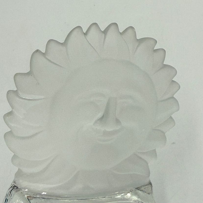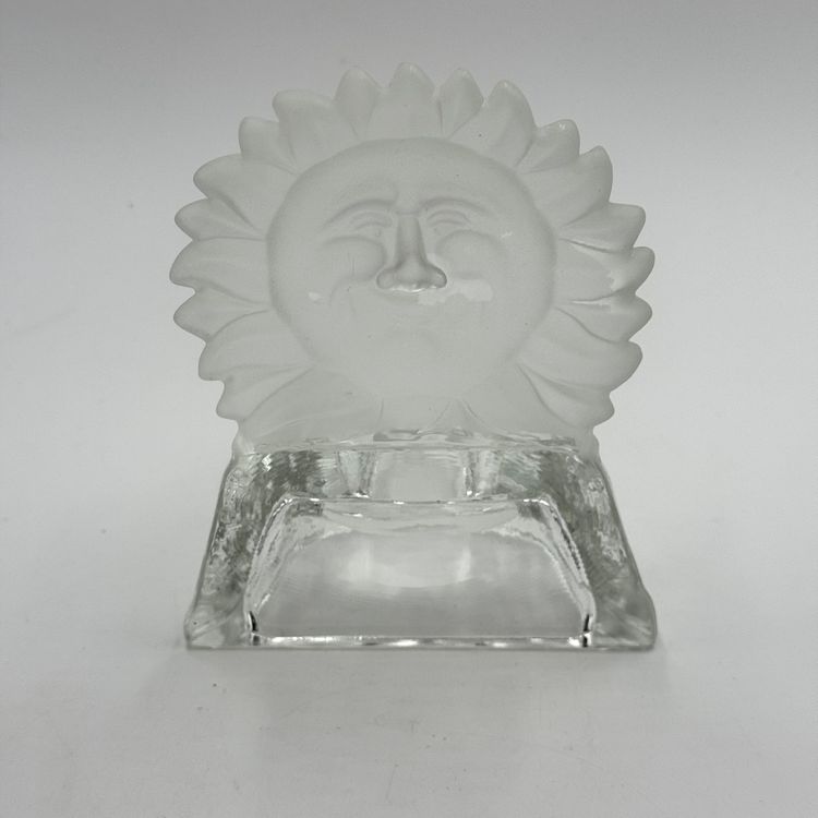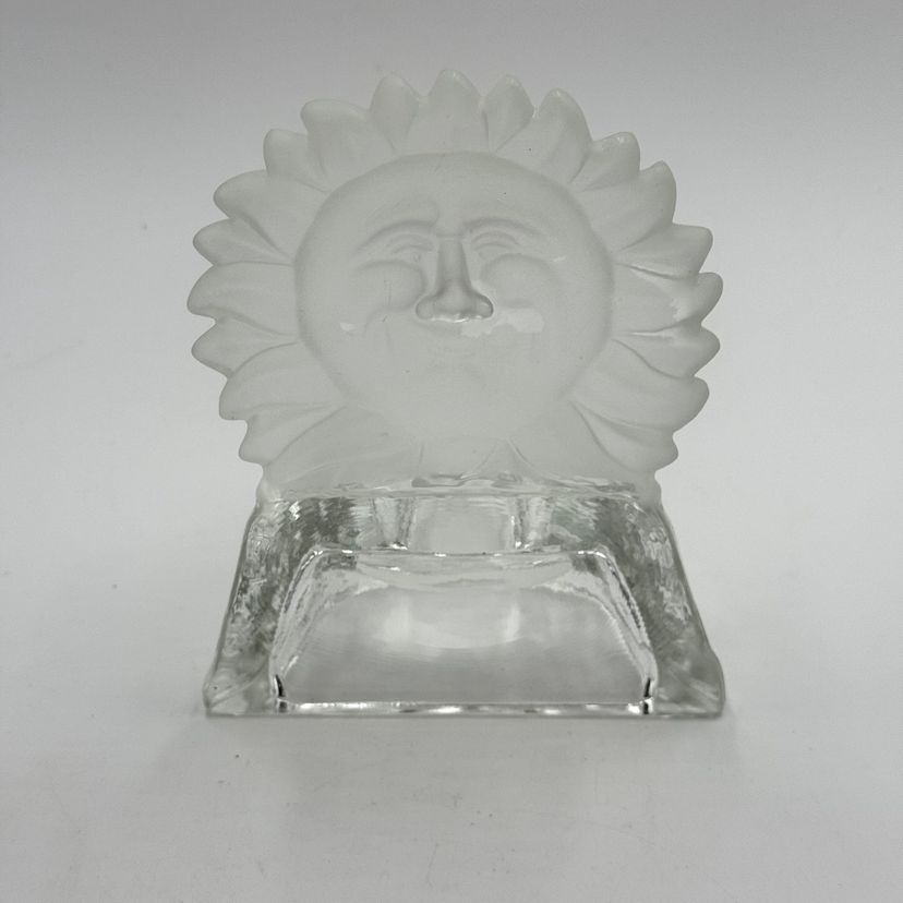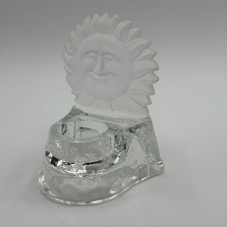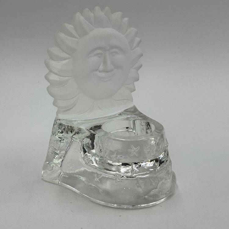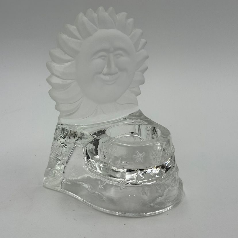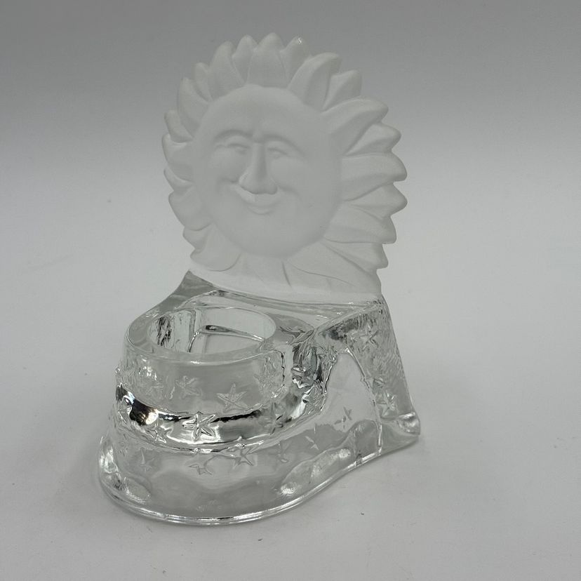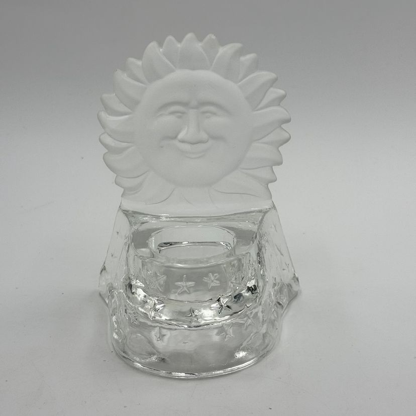 In good condition. Does not have any cracks. There is a small chip on one of the tips of the sun. Tea light holder with frosted celestial sun and clear base with stars. Measures 5 1/2 inches tall and 4 1/4 inches long.