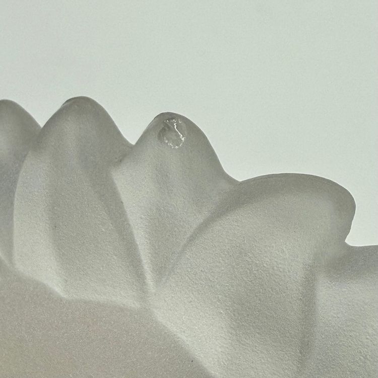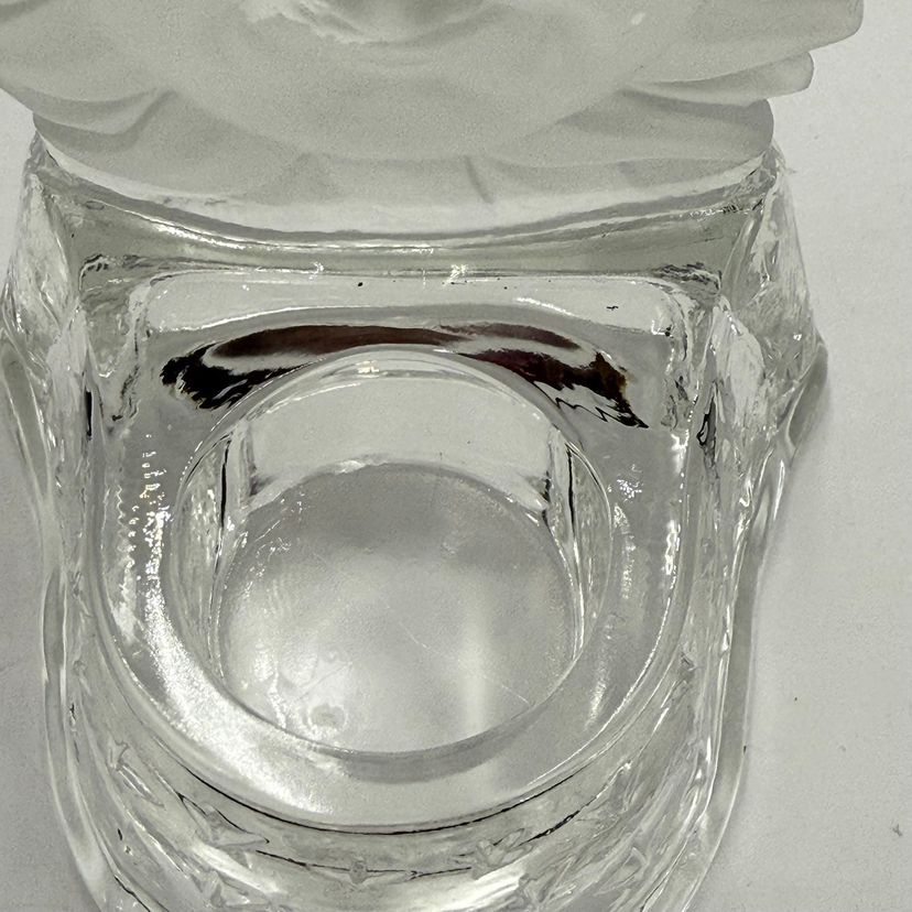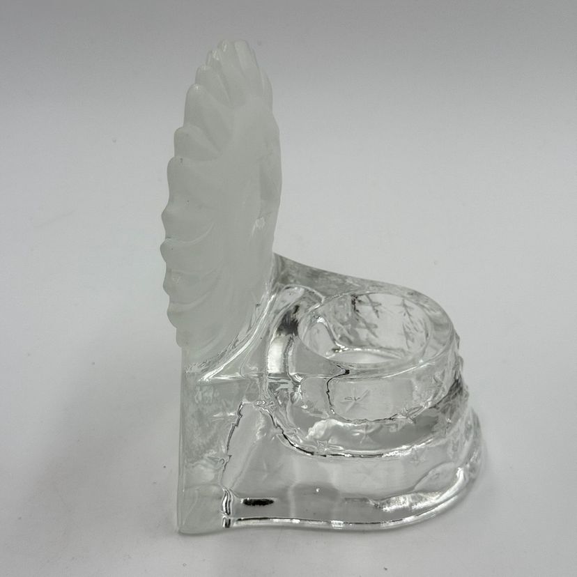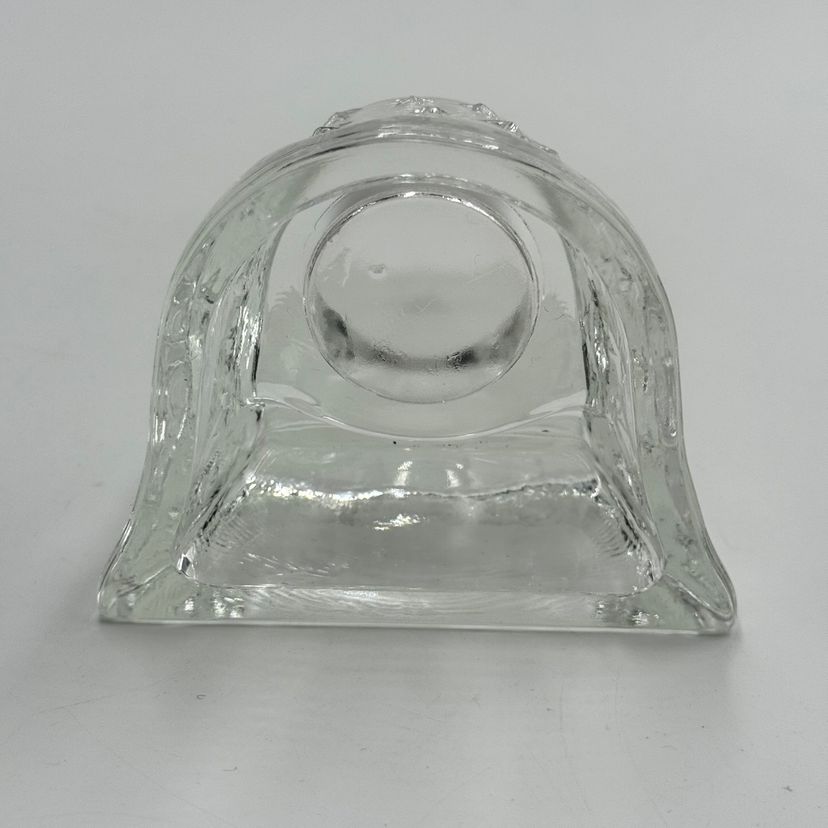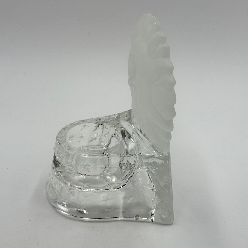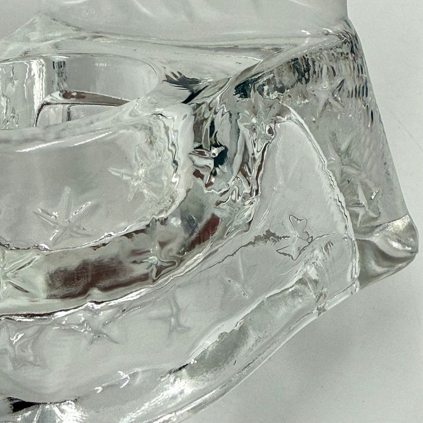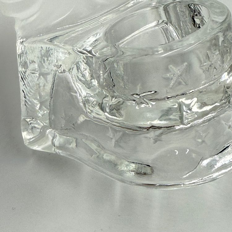 In good condition. Does not have any cracks. There is a small chip on one of the tips of the sun. Tea light holder with frosted celestial sun and clear base with stars. Measures 5 1/2 inches tall and 4 1/4 inches long.