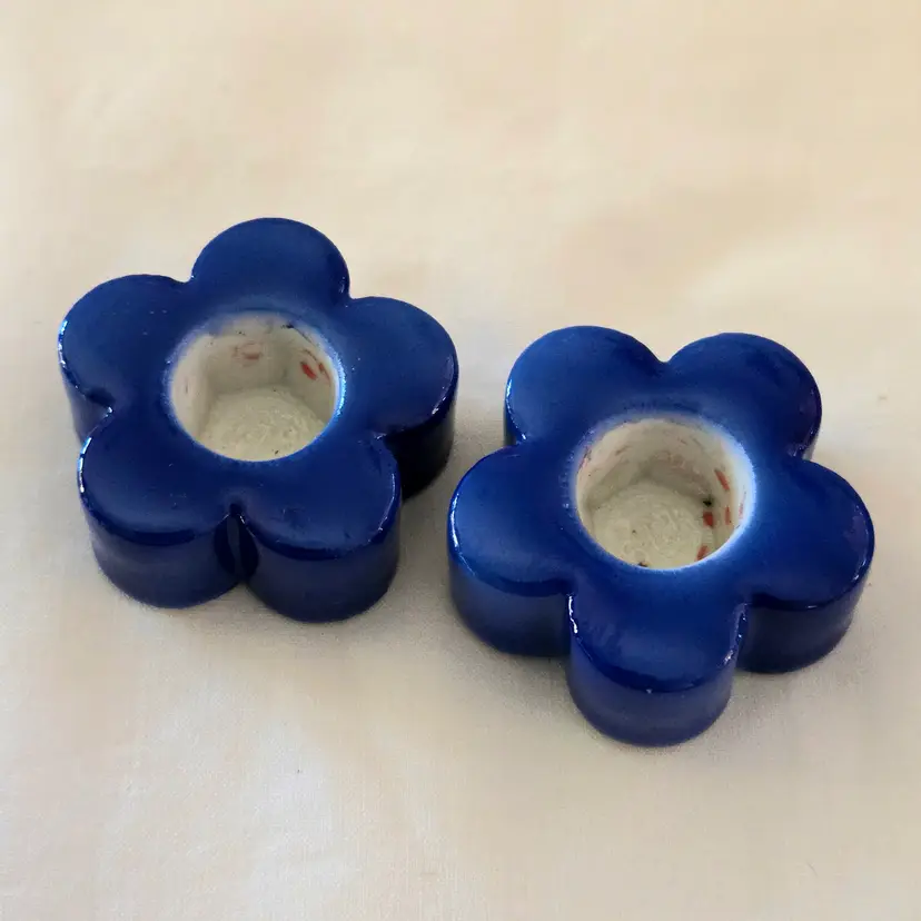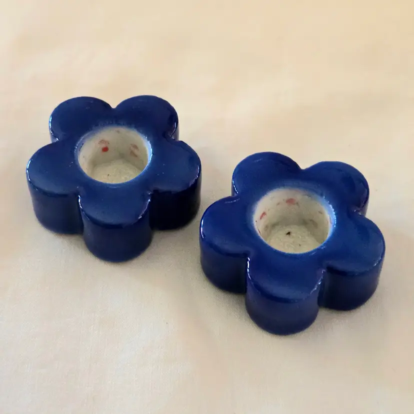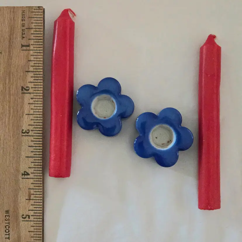Ceramic Candlestick Holders Funny Design W. Germany miniature set of 2 with red wax candles. Used condition with remnants of wax, actual candles have bends, dents,  has signs of melting, etc. NOTE: color rendition may differ slightly from the actual item you will receive if purchased due to lighting conditions. Please view all the photos and please ask any questions prior to purchase when possible.