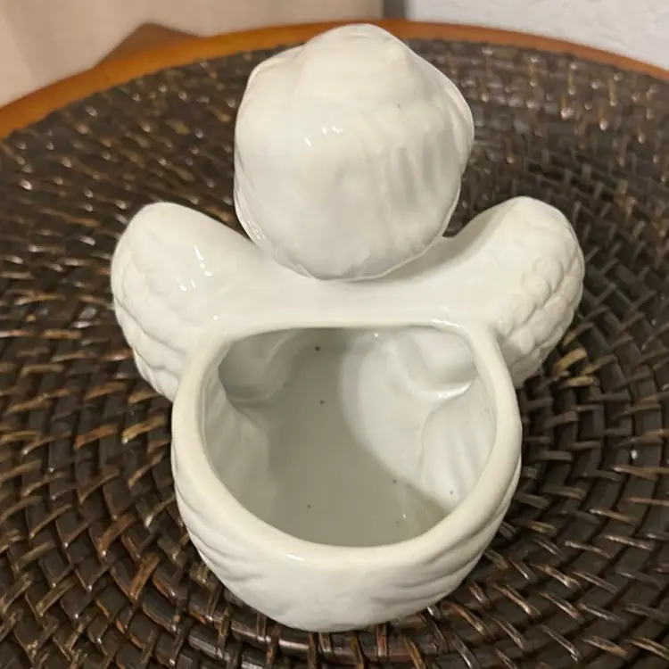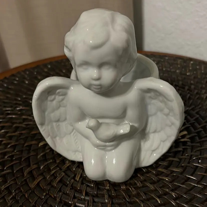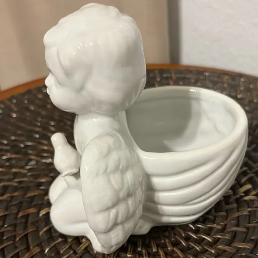 This is a vintage white ceramic cherub planter or vase, likely from the 1980s, which is a popular collectible item. It features a cherubic angel with outstretched wings, holding a small bird.
