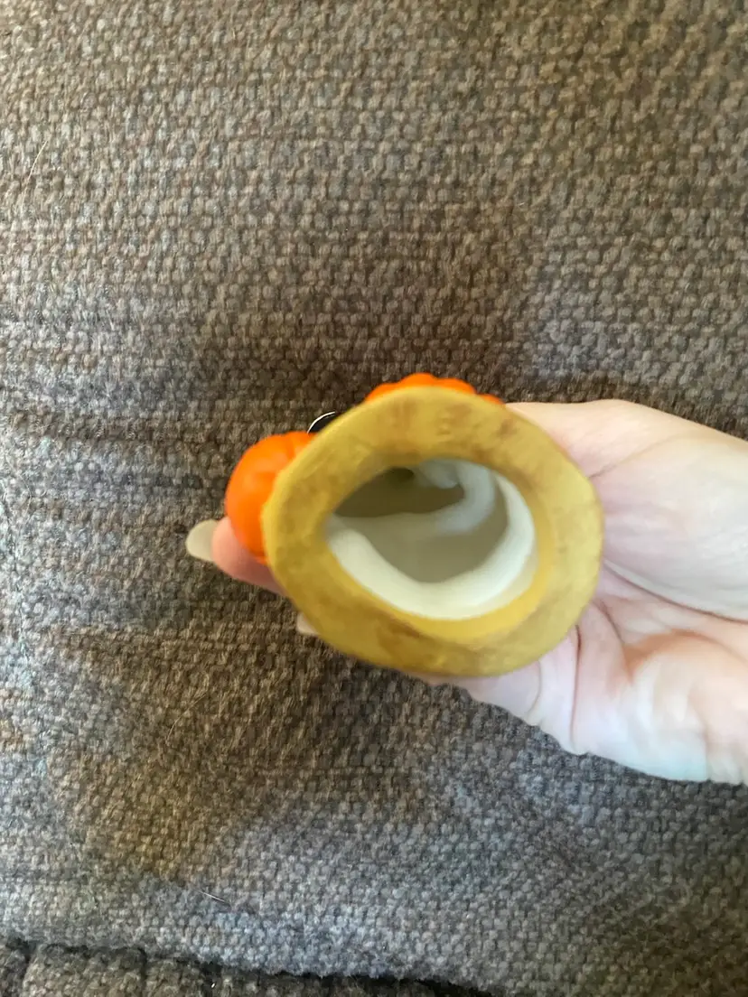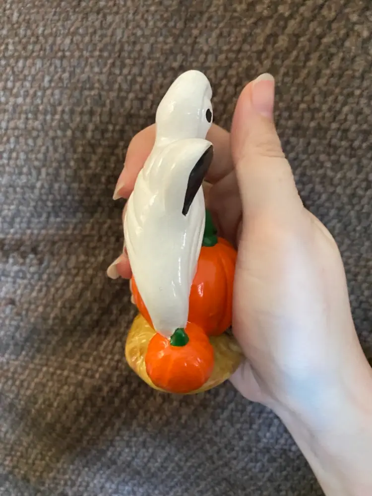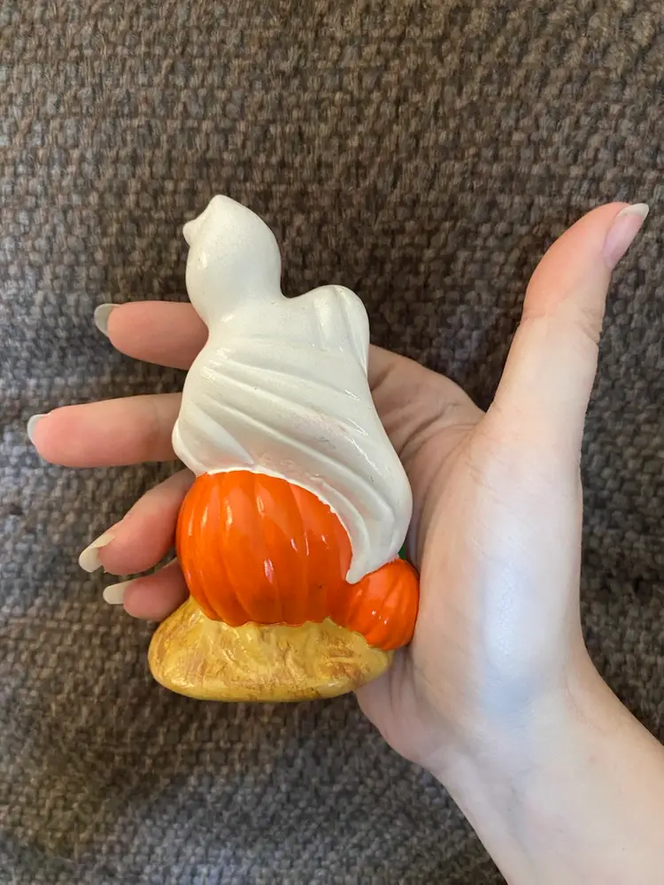 Ceramic Ghost With Two Pumpkins 2 1/4” X 1 3/4” X 3 3/4” Item is in good condition with no chips or cracks.