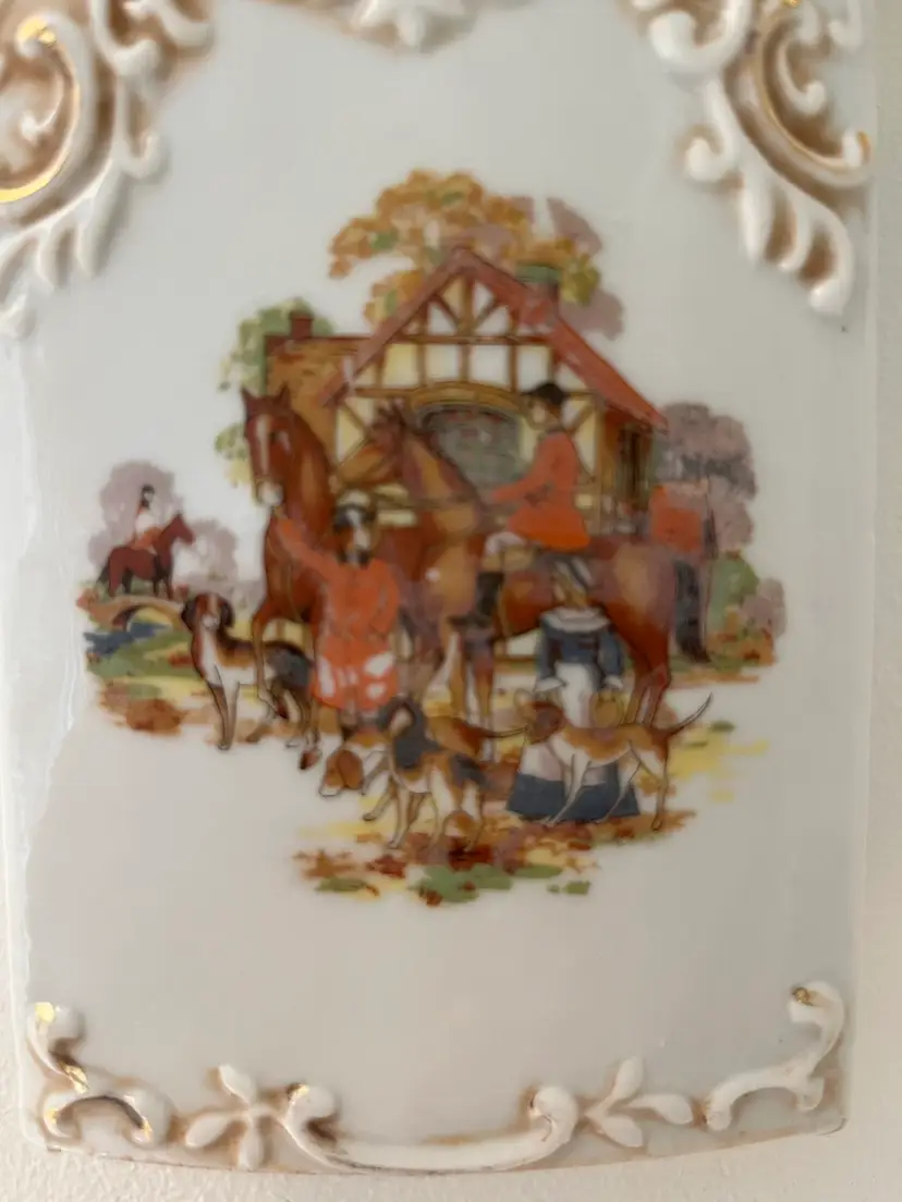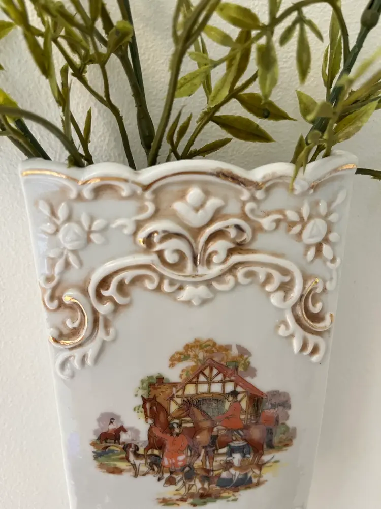 Vintage ceramic wall pocket featuring a fox hunt scene on the front. Marked The Hinode and made in Japan. Measures approximately 6” x 3.5”