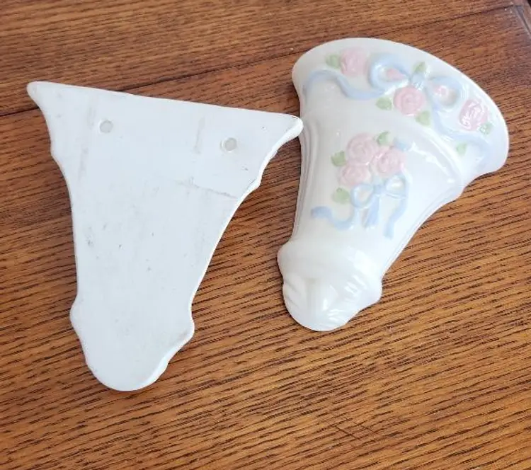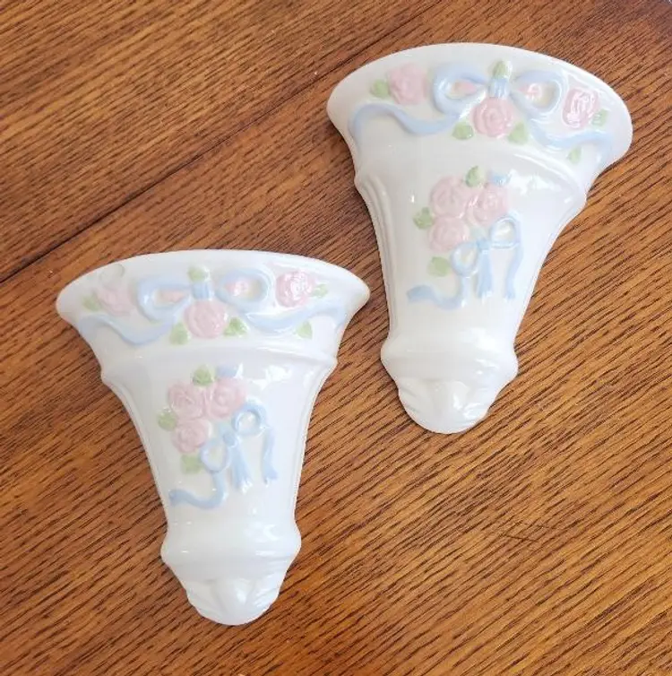 Ceramic Wall Pocket set of 2 Floral & Ribbon design, off white with raised blue ribbon and pink flowers 5 1/2" tall, one has a chip on front top shown in picture. Holes on back for hanging.
