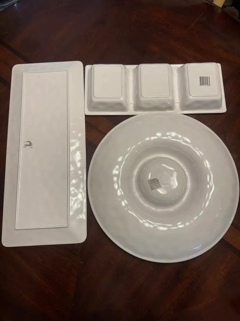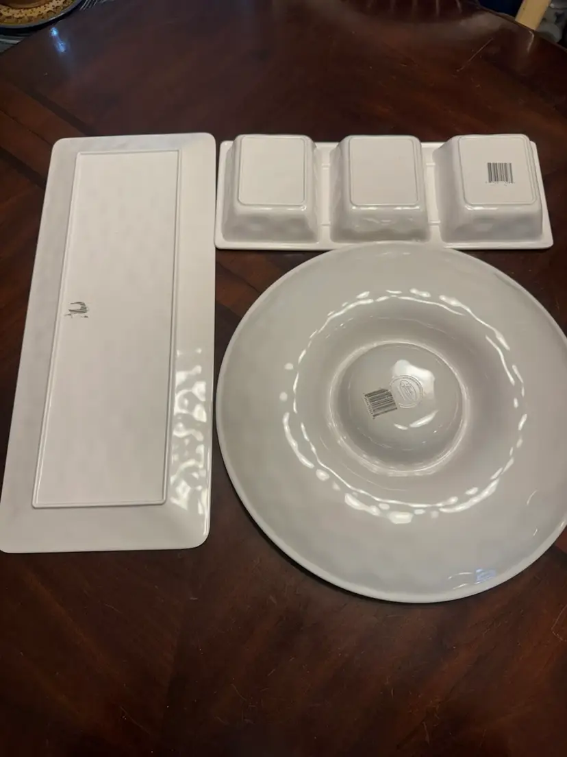 Divided dish is 15” x 5.5”; Rectangle platter is 19”x8”; Round chip n dip platter is 14” diameter with 5” diameter dip section.