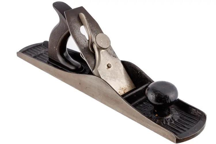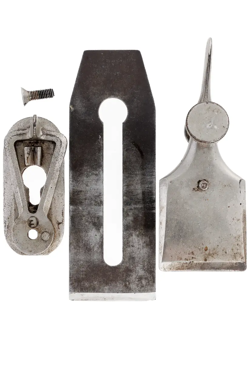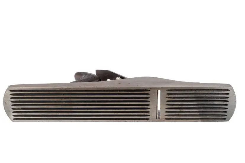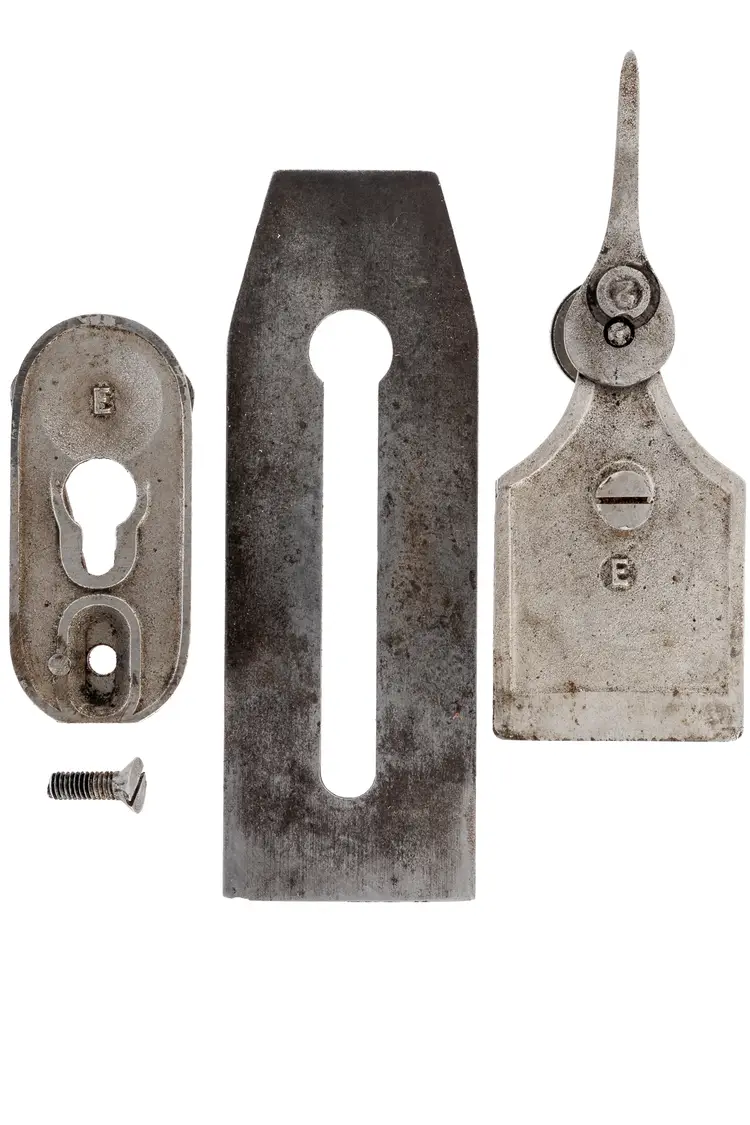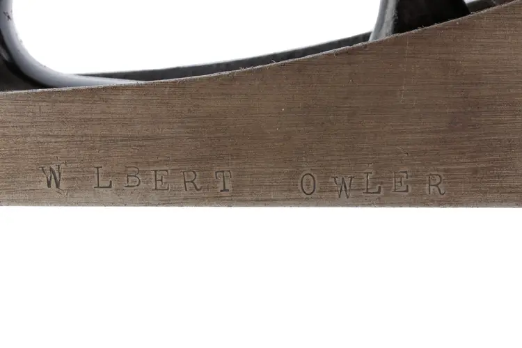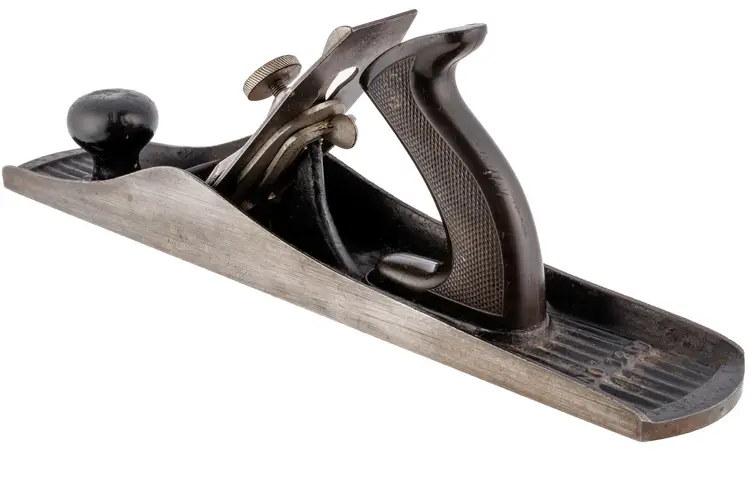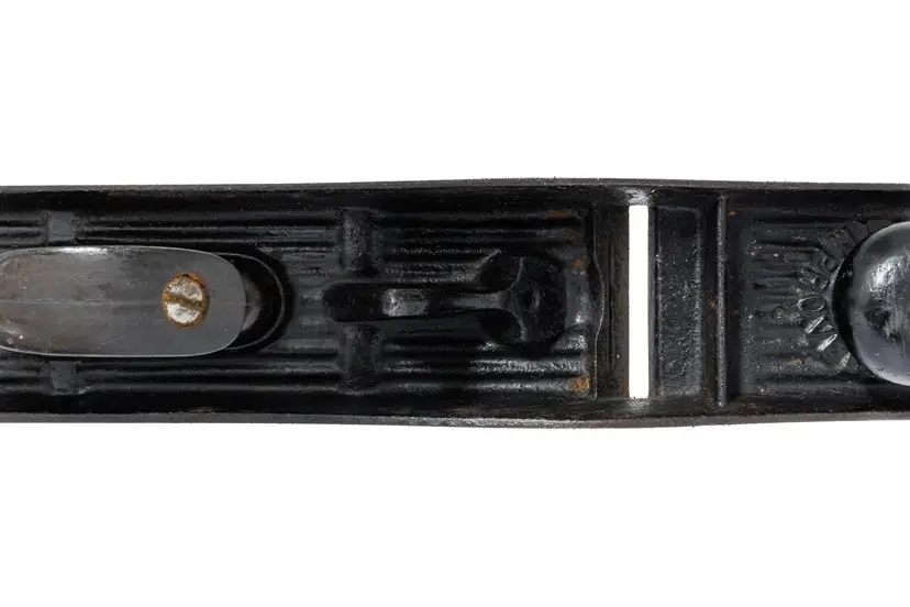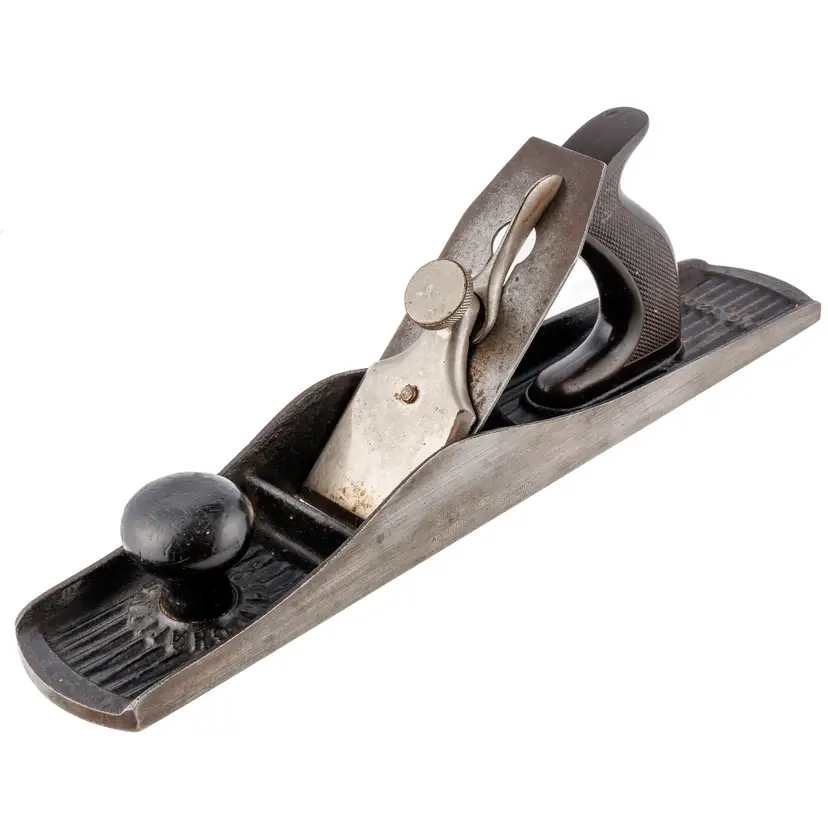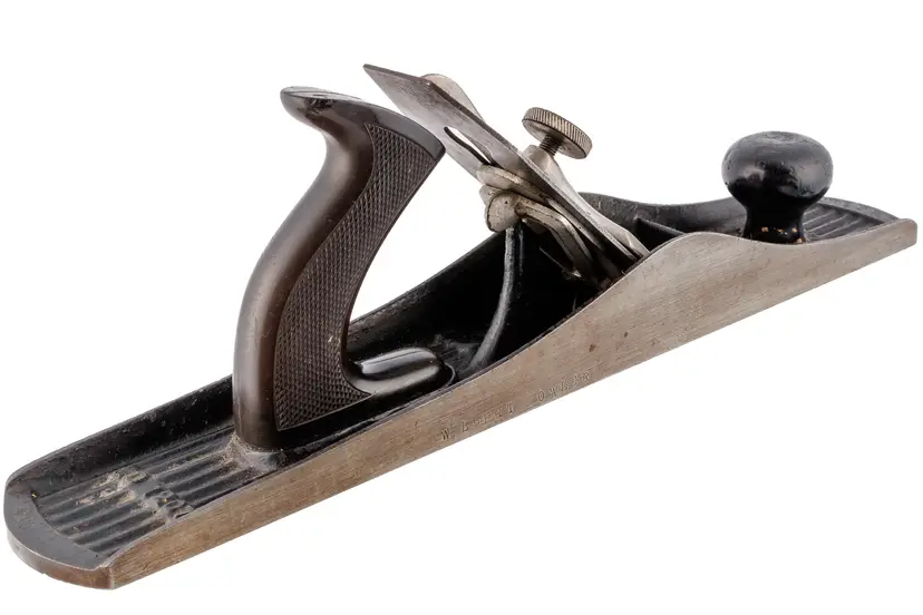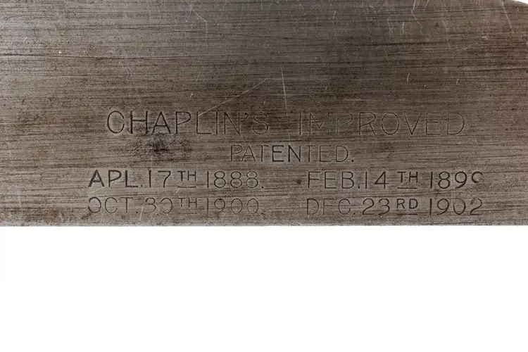 A Good Plus Chaplin's Improved Patent No. 1207 Jack Plane. It has 99% of the original stamp on the left side with all 4 patent dates (1888, 1889, 1900, and 1902), as well as a previous owner's stamp on the other side. A great example that is 100% complete and original with no damage. The iron does have a small chip at the edge so it will need sharpened for use. 15" long with a 2-1/8" wide cutter.