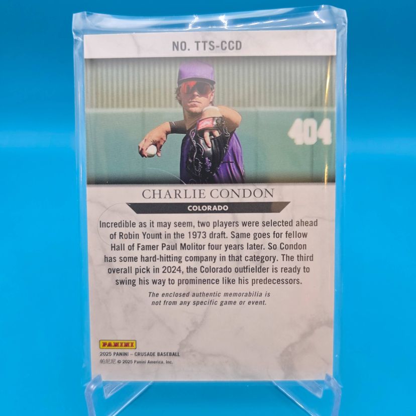 Charlie Condon 2025 Panini Crusade jersey patch with pinstripe Tools of the Trade. NM or better. Shipped BMWT due to thickness.