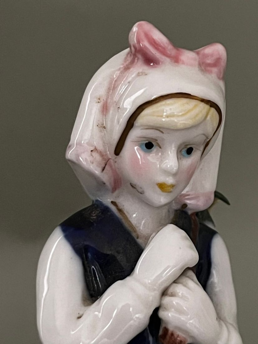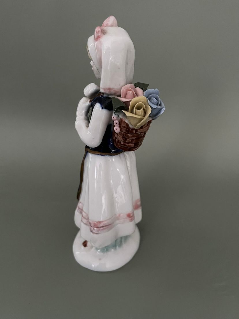 This beautiful porcelain figurine is a must-have for any collector of mid-20th century decorative items. Crafted with exquisite attention to detail, this charming piece features a delicate dame who measures 6.5 inches in length. Made from high-quality porcelain, this figurine is a stunning addition to any display case or shelf. Excellent condition .