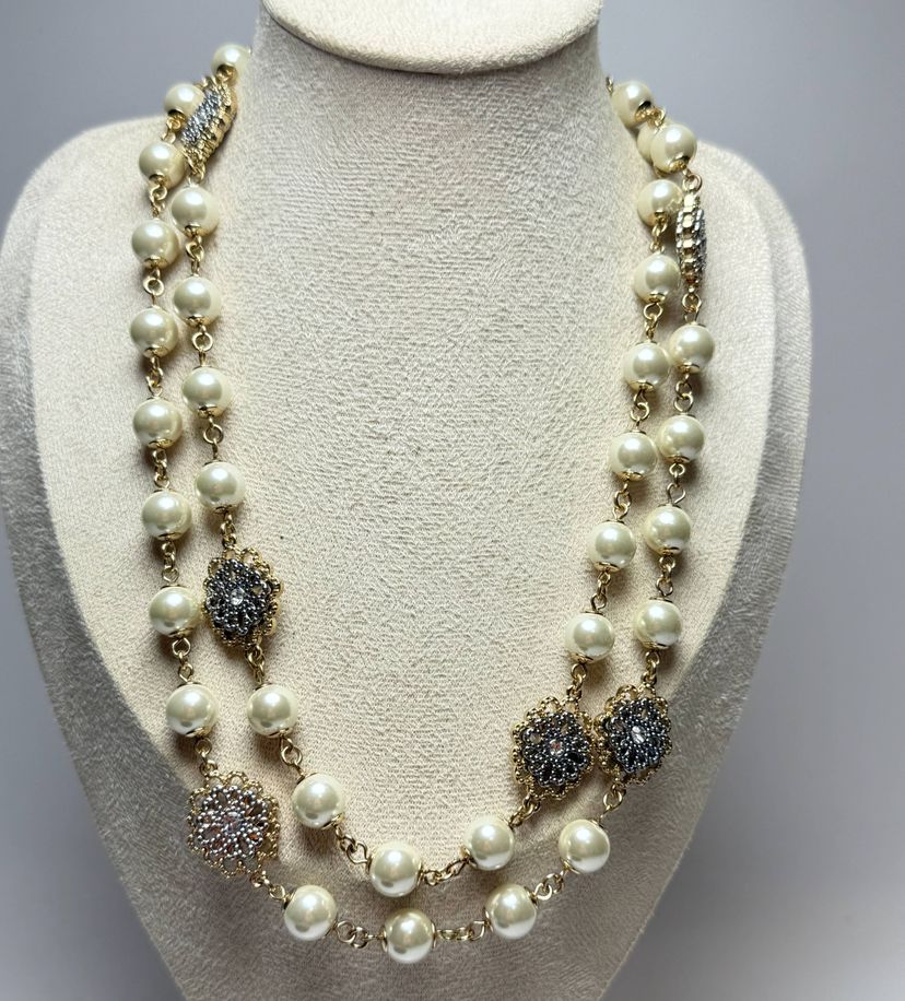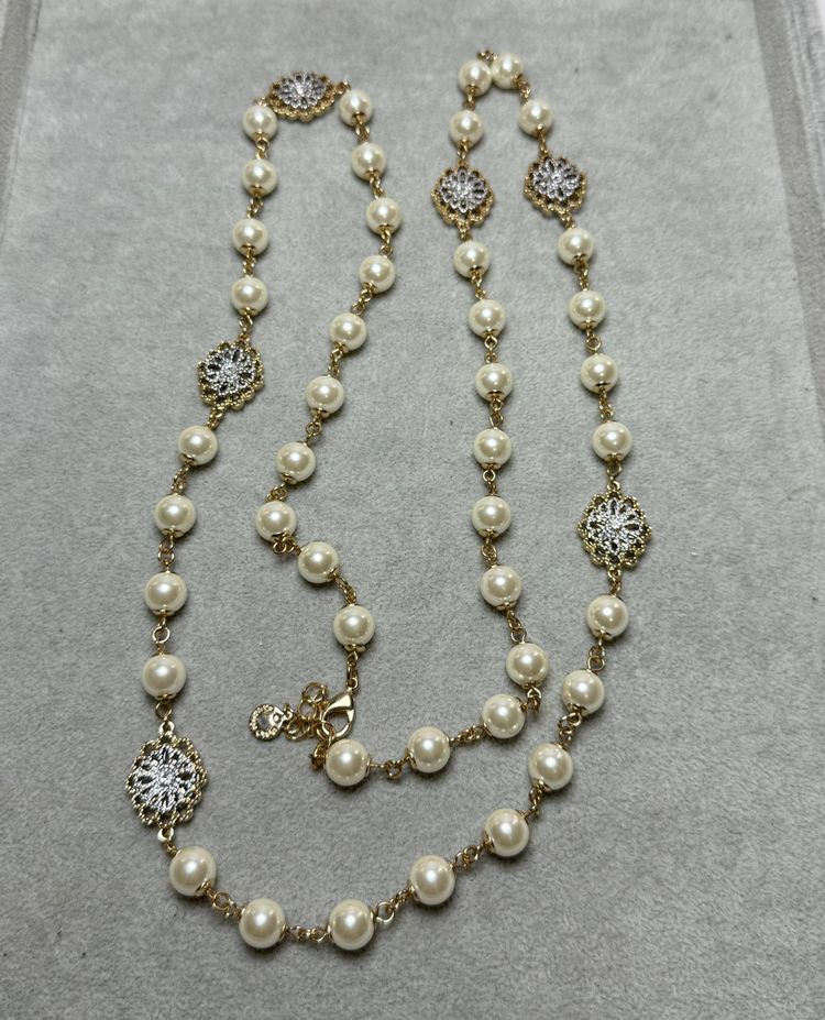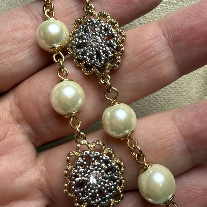 Charter Club Two Tone 42" Heavy Faux Pearl Station Necklace Filigree Floral Well made costume jewelry. Great condition. Little to no wear. Two tone Gold and silver. Signed on hang tag.